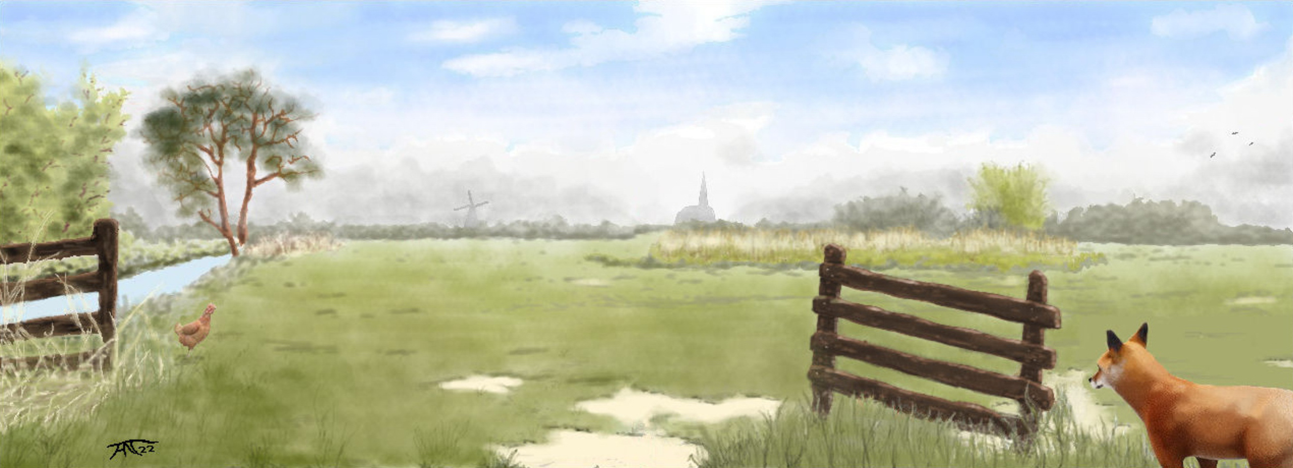 Ik heb het simpele voorbeeld uit het kinderboek waar maarten voordoet hoe je een landschap schildert uitgewerkt met brush techniek. Maar nu met een verhaal dat een vos het kippetje wil hebben.