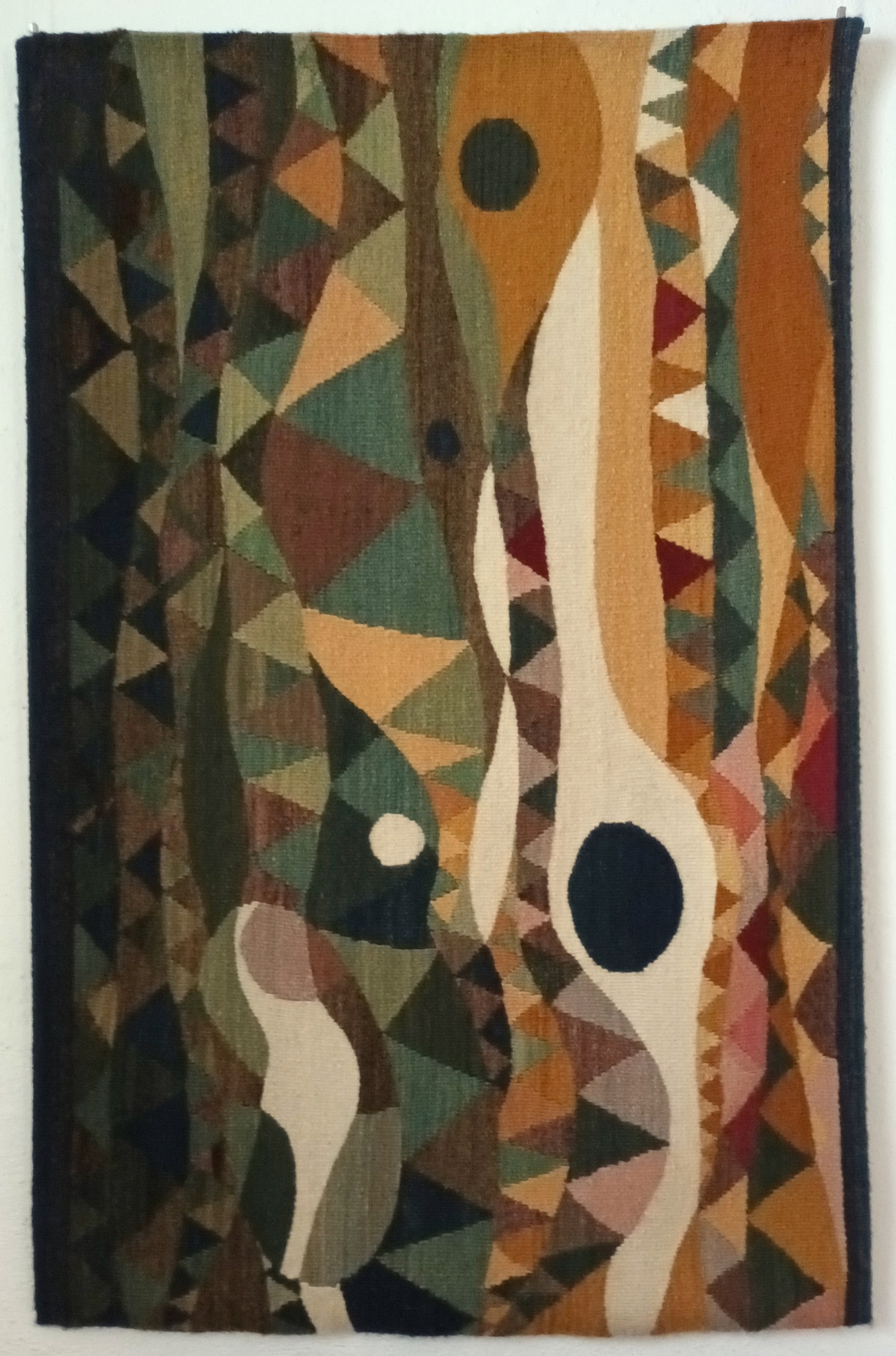 Mijn wandkleden worden gemaakt van schapenwol die ik zelf spin, waarna ik deze verf met plantaardige materialen , zoals indigo, meekrap en fustic. De techniek is inlegwerk op 2 schachten.