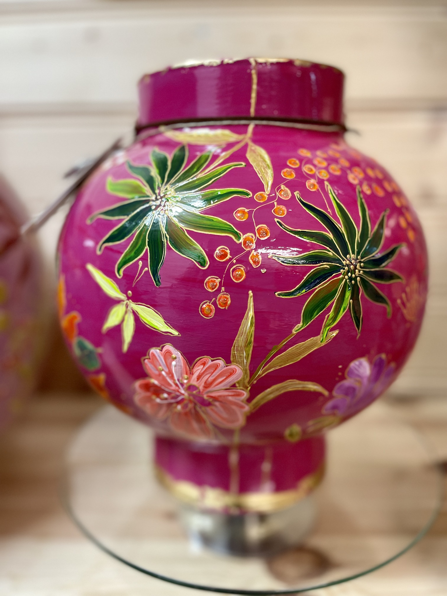 Handbeschilderde vaas van glas. Rondom beschilderd met bloemen. Deze vaas staat momenteel te koop bij Intens bloemen in Nijmegen.
