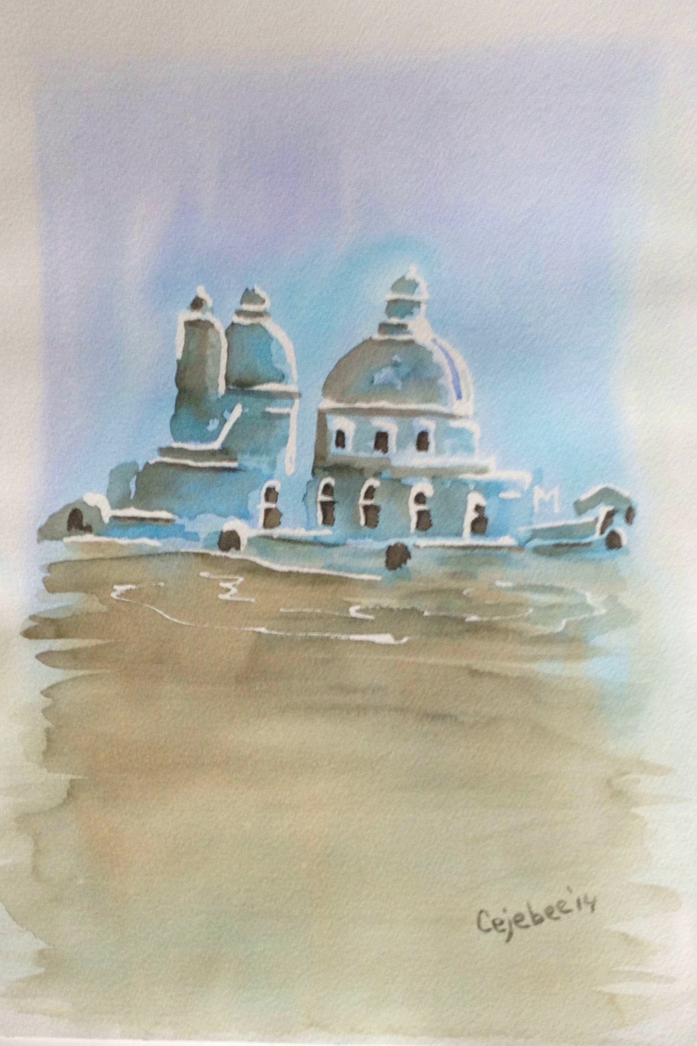 Weer een aquarel. Mijn tweede, dit keer naar een voorbeeld. Ook al vloeiden de kleuren alle kanten op; het lukte toch deze kathedraal te laten ontstaan.