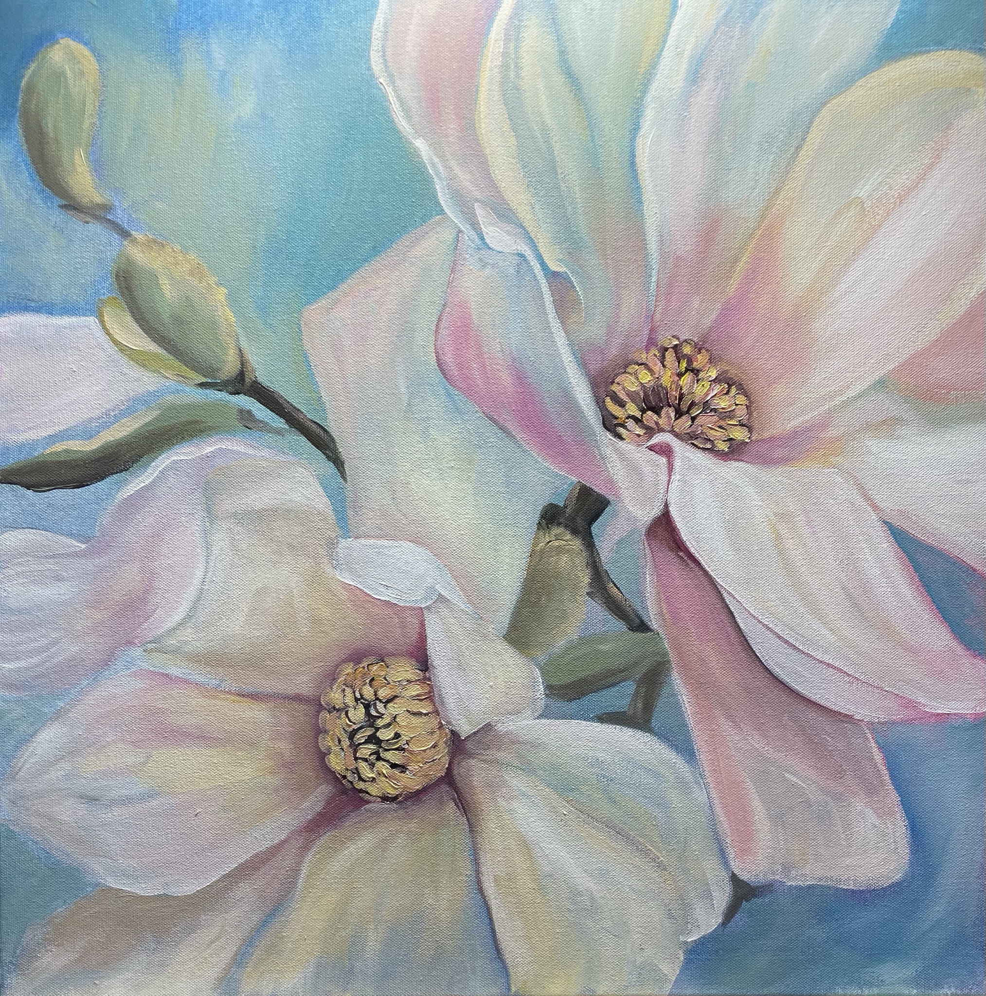 Blauw Bloem Roze Lichtblauw Pastel Magnolia Bloemenschilderij