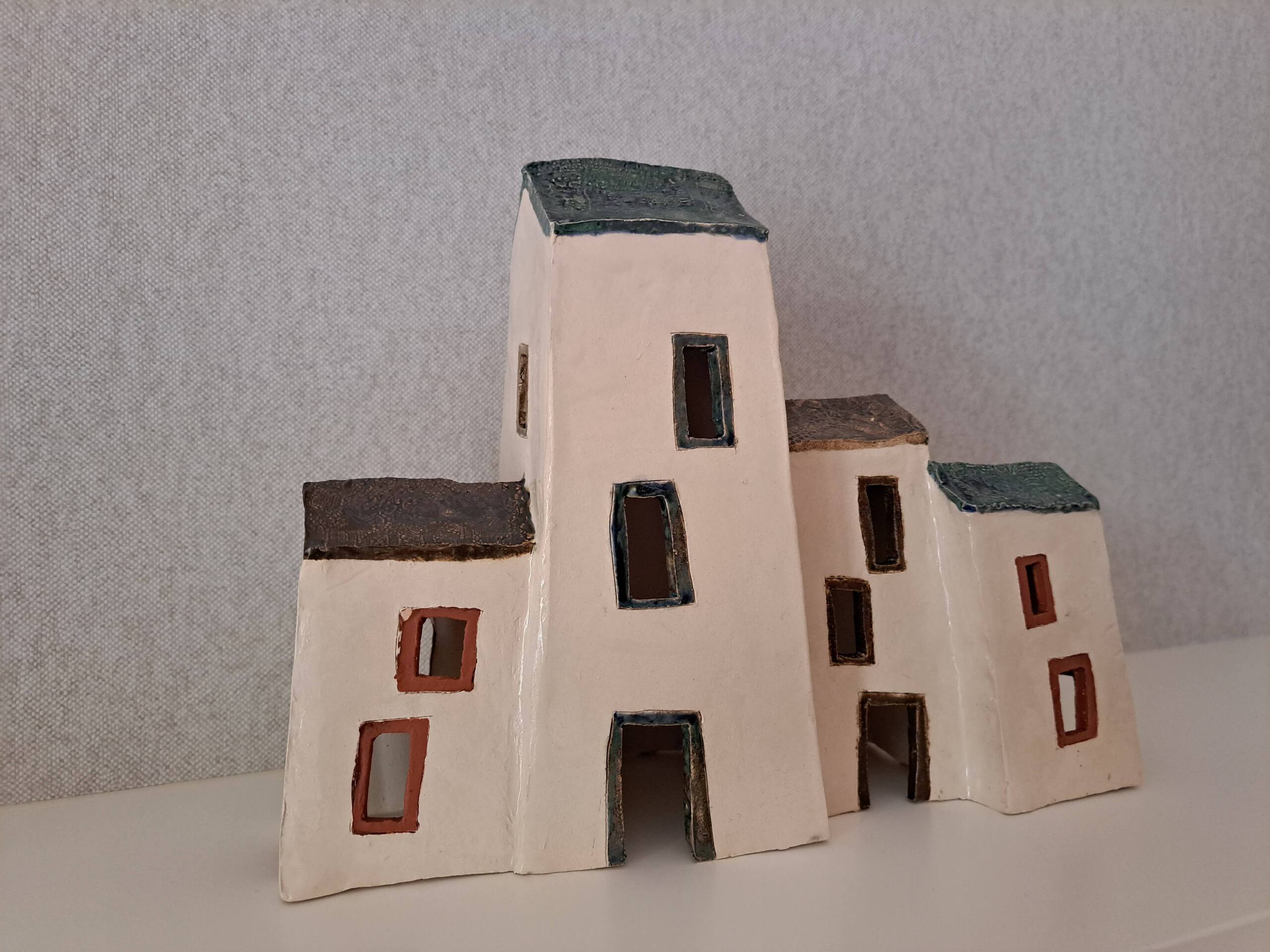 Een rijtje huizen, schots en scheef aan elkaar. De wanden zijn creme, de daken en kozijnen in verschillende kleuren. De daken zijn met prints van kant.