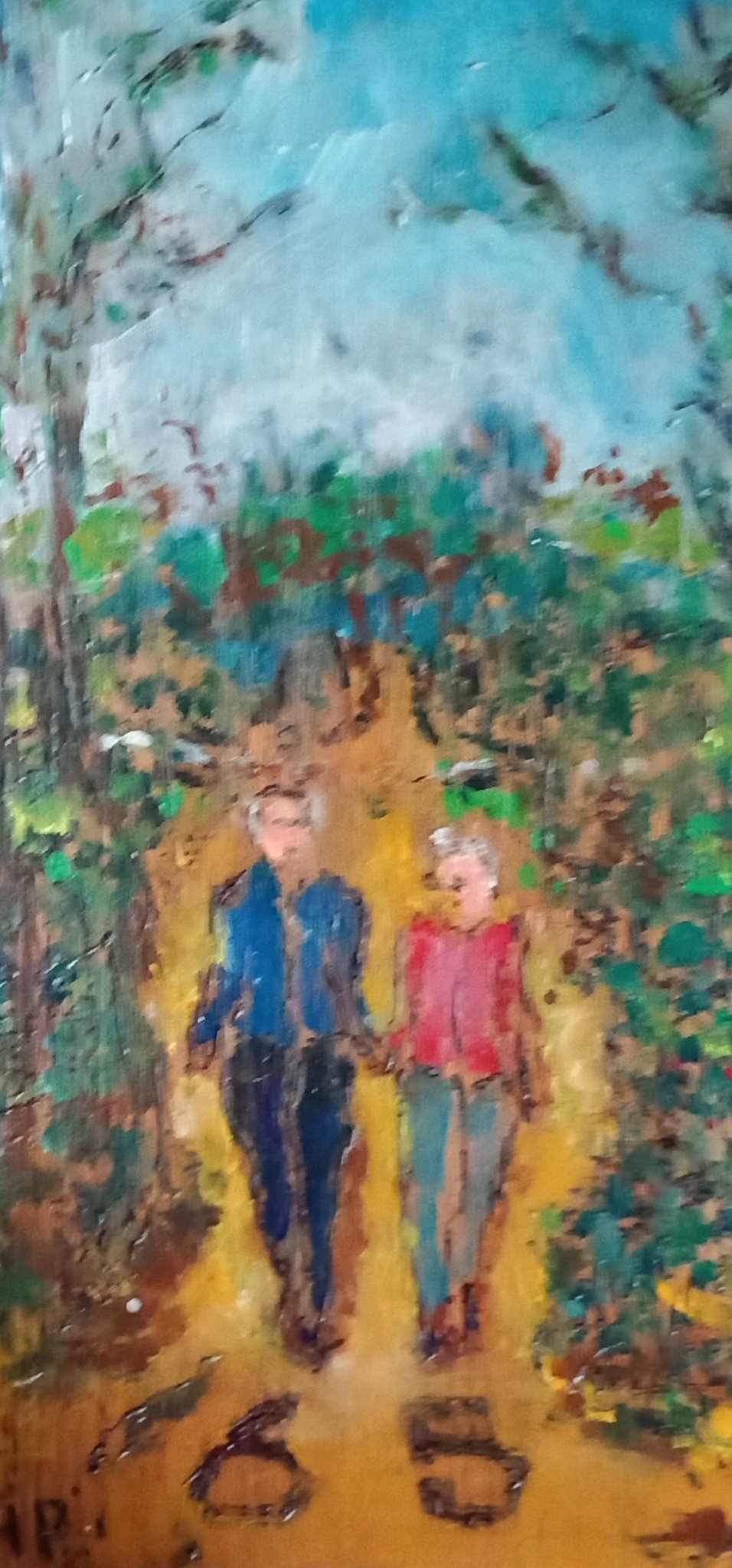 Wandeling op het sikkelaantje Schilderwerk op blok met als techniek houtbranden en acrylverf.