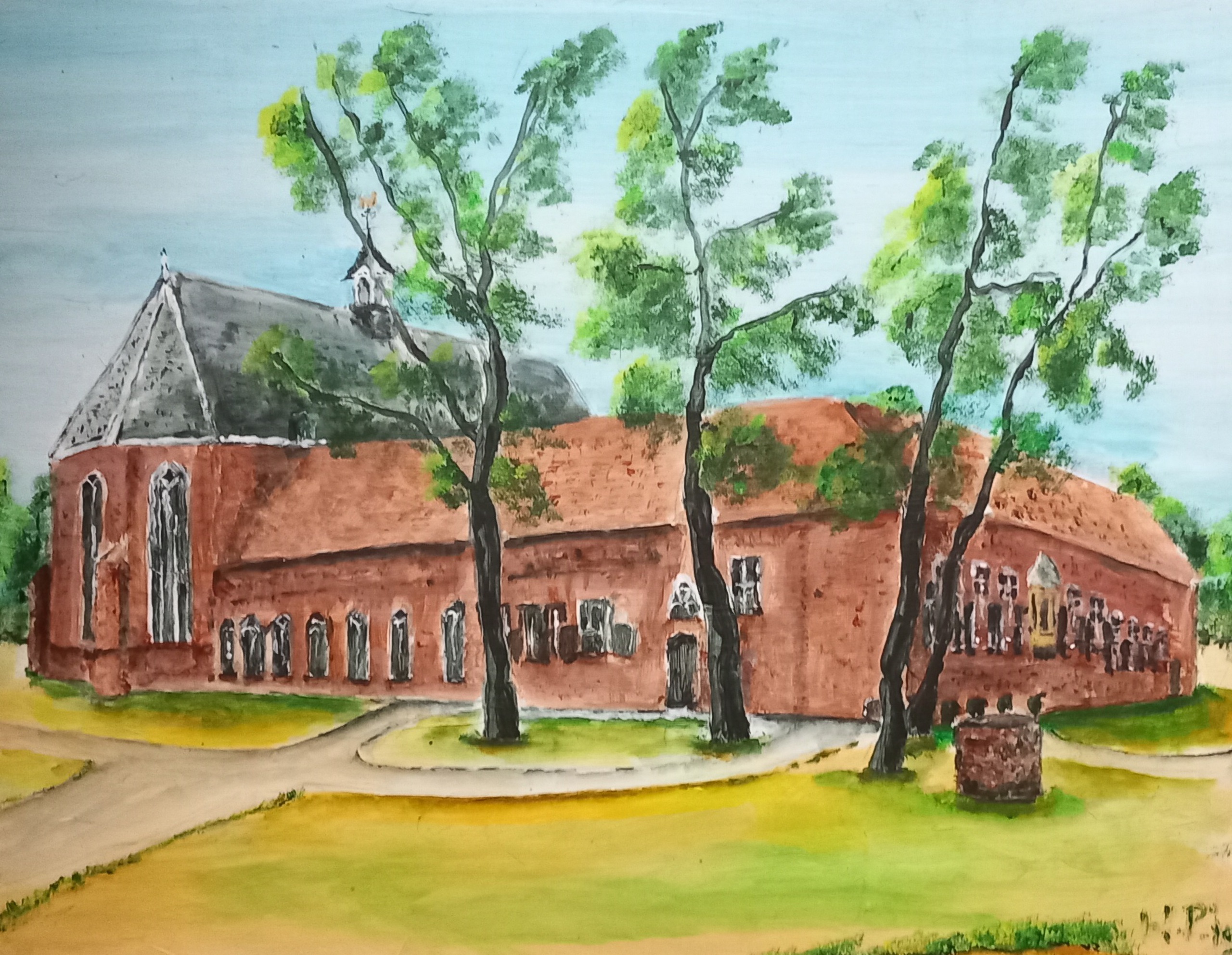 Acrylverfschilderij op Multiplex. Hierbij wordt het klooster van Ter Apel afgebeeld