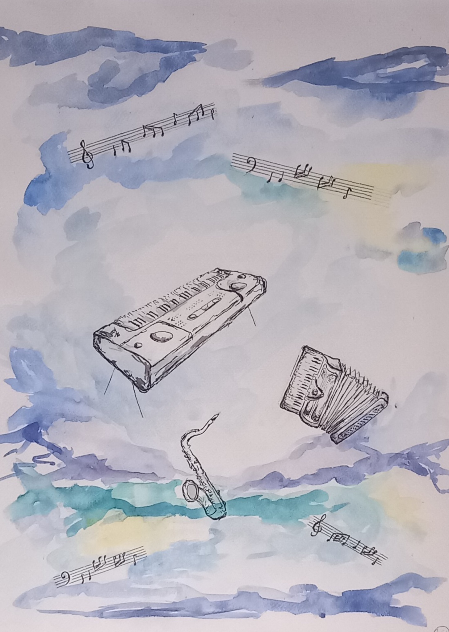 Compositie van muziekinstrumenten van aquarel en oostindische inkt op aquarelpapier