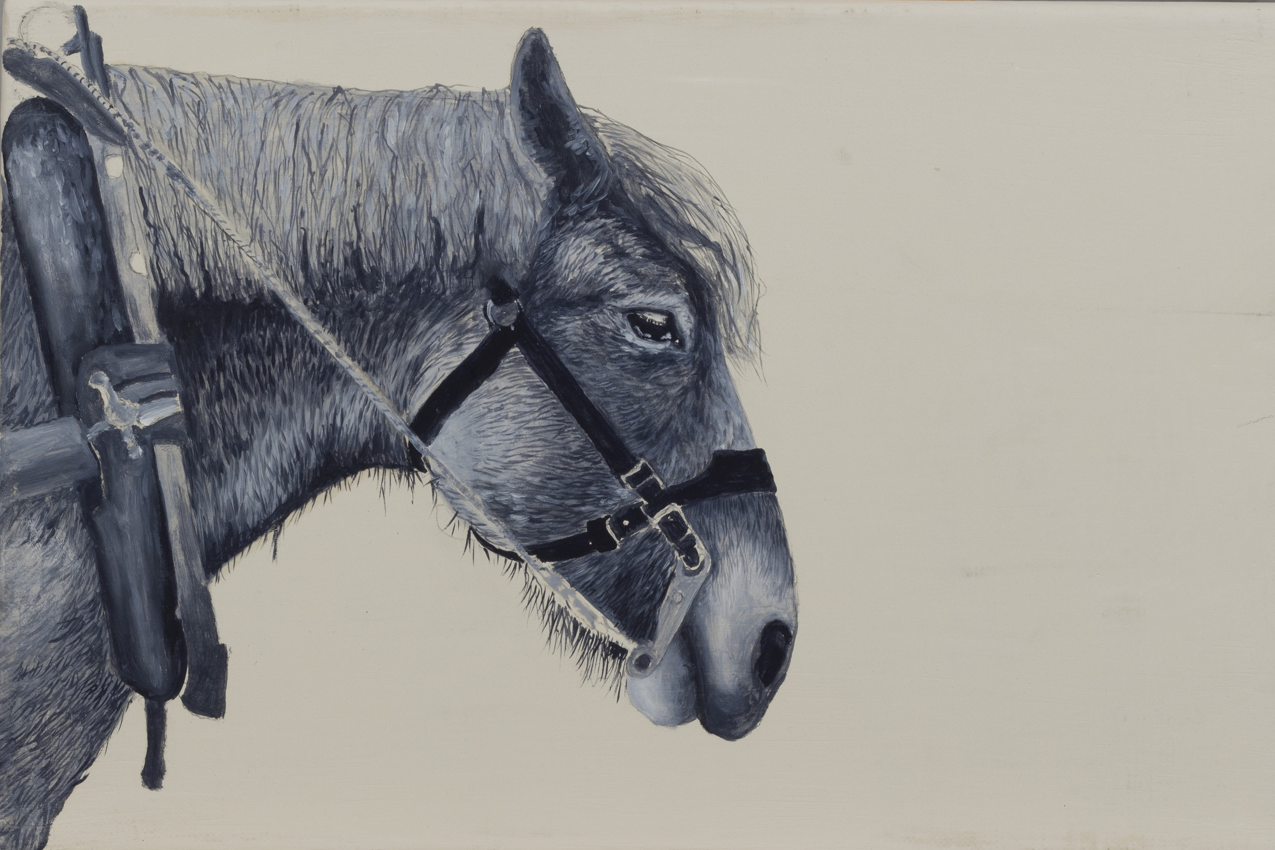 Portret van een Zeeuws trekpaard, in grijs tinten, geïnspireerd op oude zwart wit fotografie.