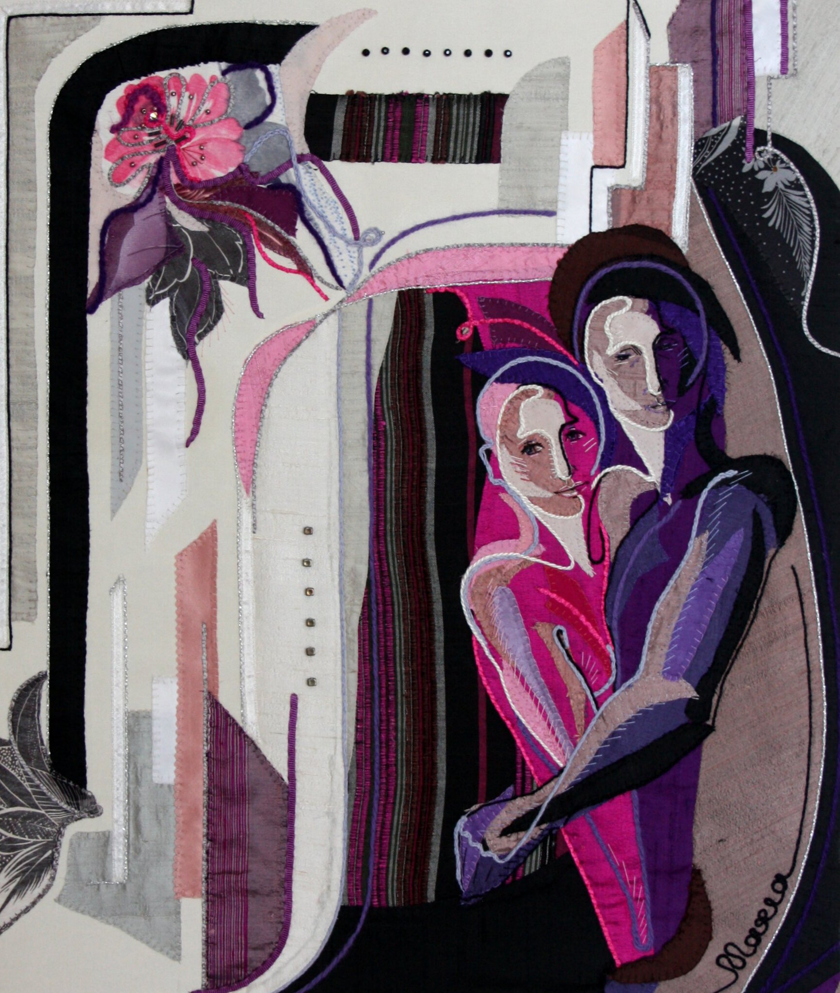 paar in paars is een liefdes paar textielobject in natuurzijde applicatietechniek