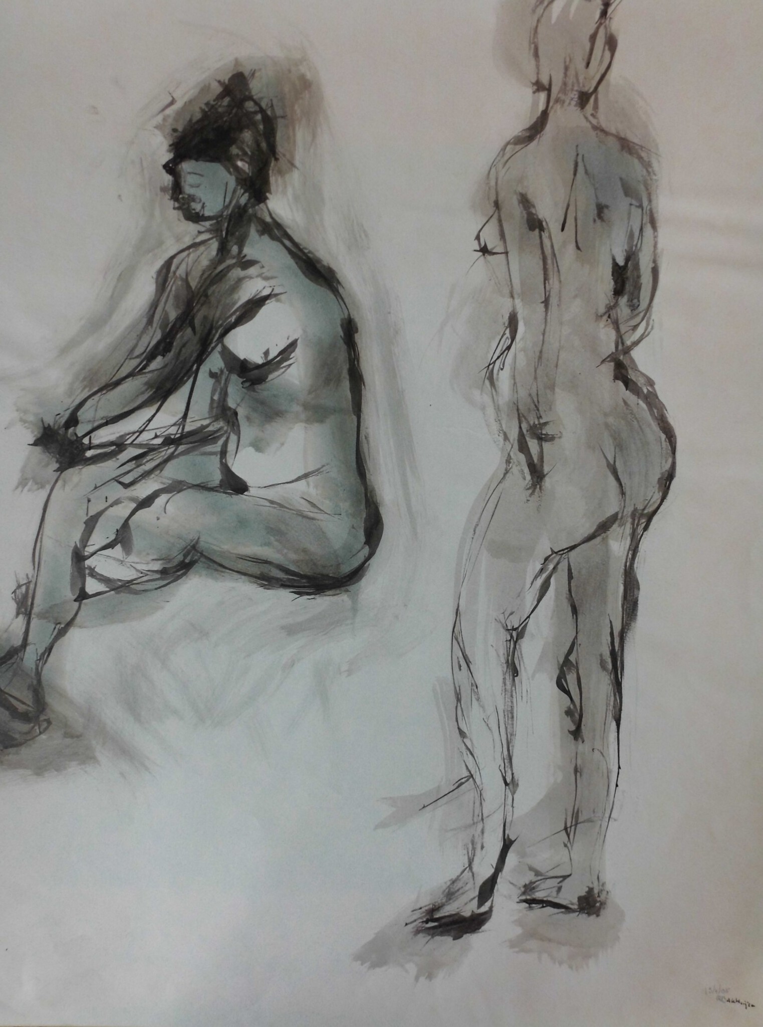 2 x naaktmodel ingewassen inkt naar waarneming. Getekend met satéstokje op wit pakpapier in lijst achter glas.