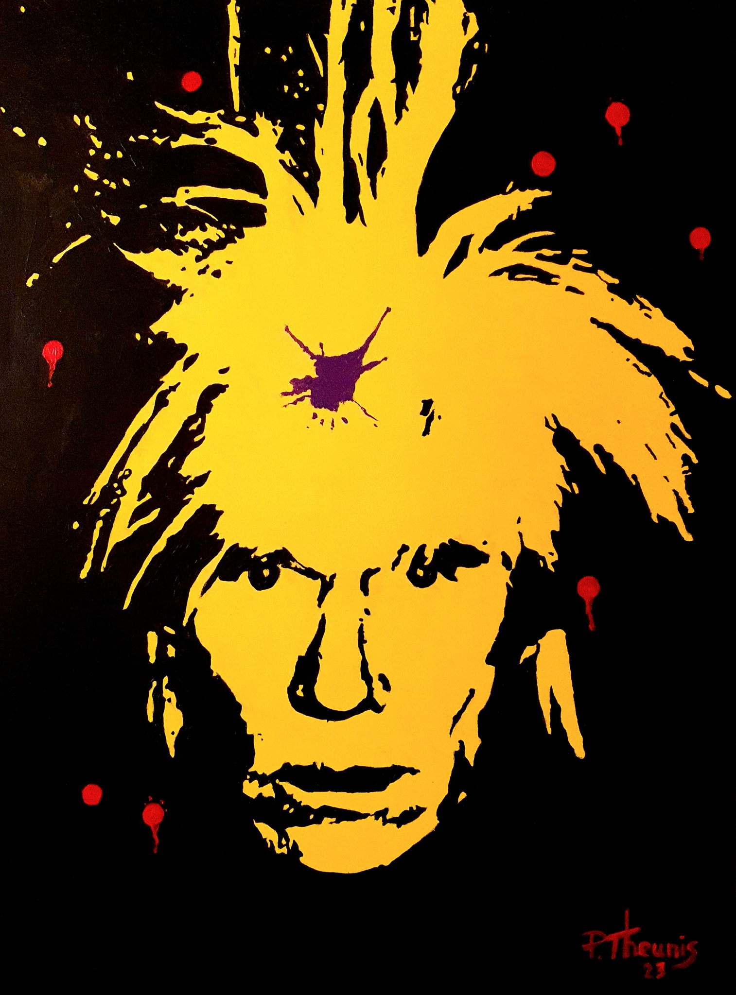 In het rijtje van de "Pop-Art idolen" mag Andy Warhol zeker niet ontbreken. Andy Warhol zou -indien mogelijk- zijn eigen dood zelf willen regisseren... en deze gedachte leidde tot het maken van dit portret in acrylverf.