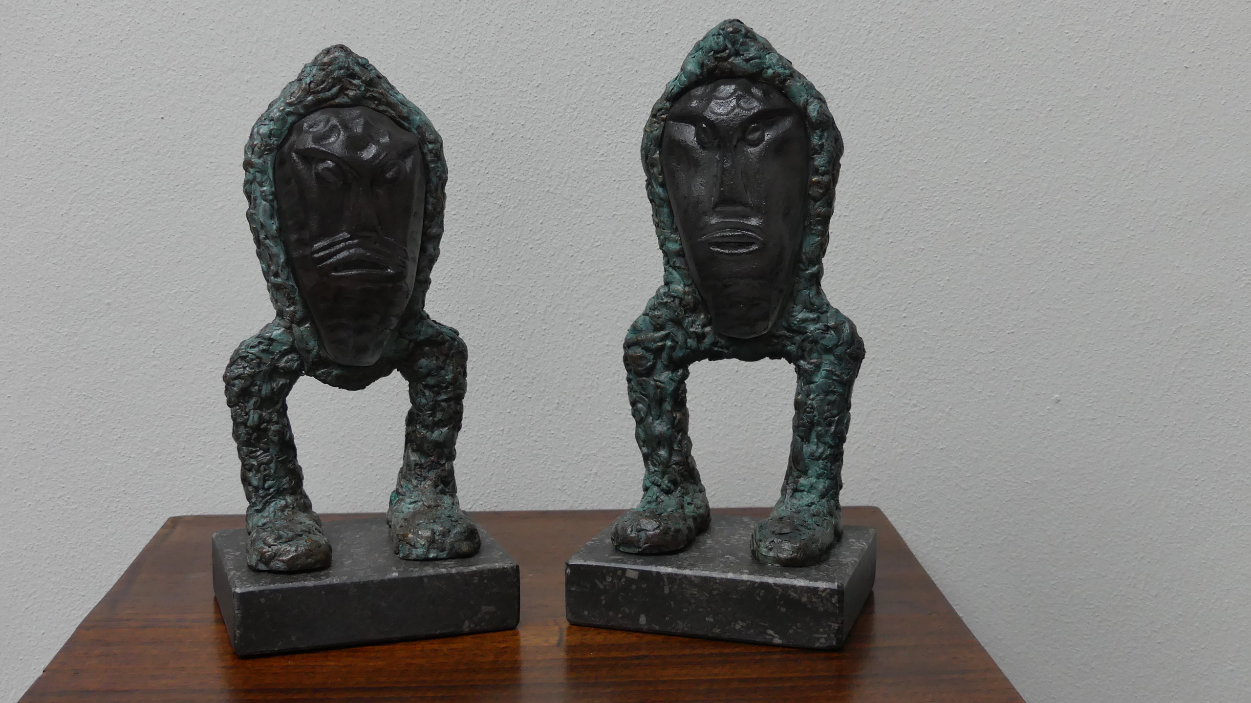 Glas volgens de castingtechniek. Brons volgens de verlorenwastechniek, afgewerkt en gepatineerd.