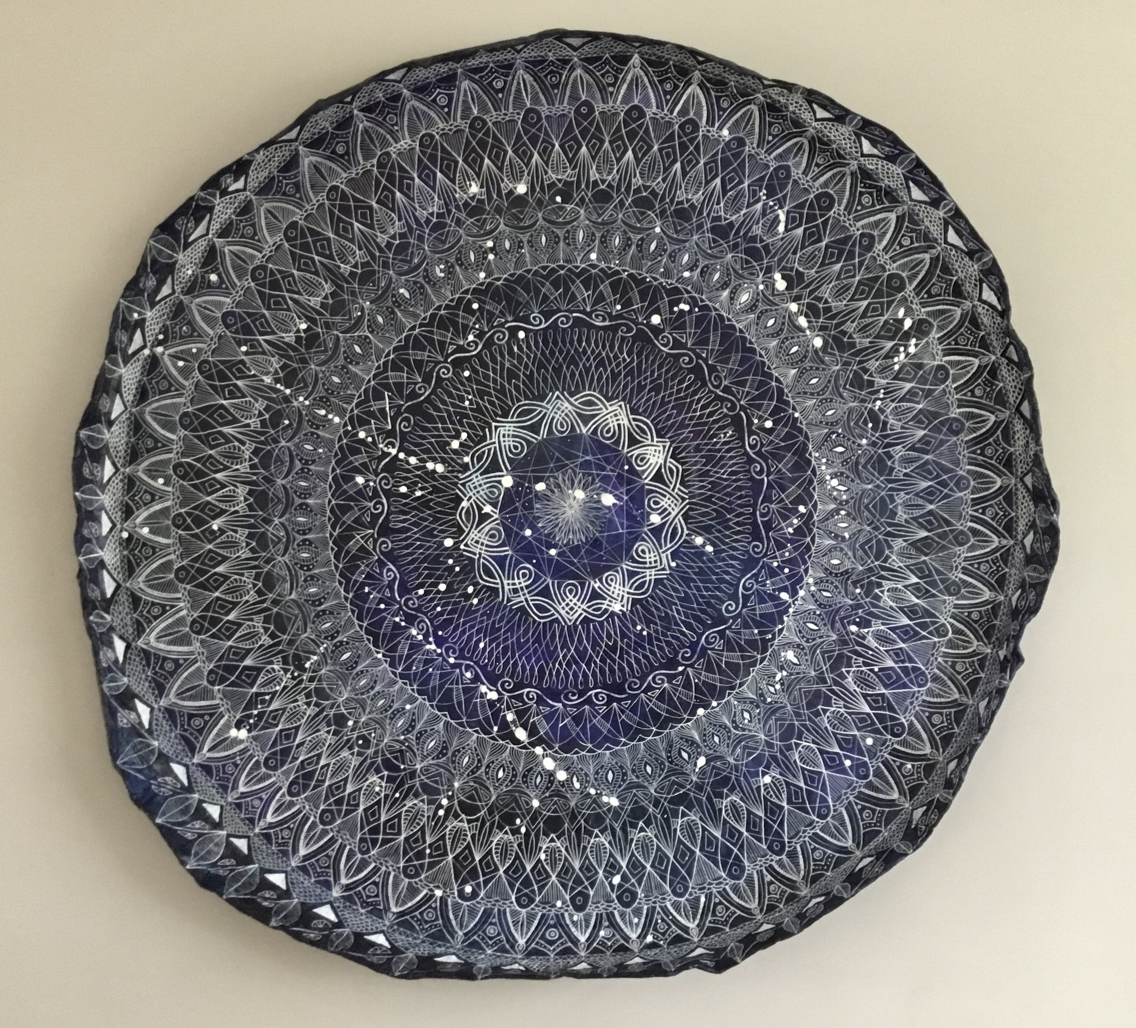 Wandbord van Papierklei. Beschilderd/bewerkt met kantpatroon.