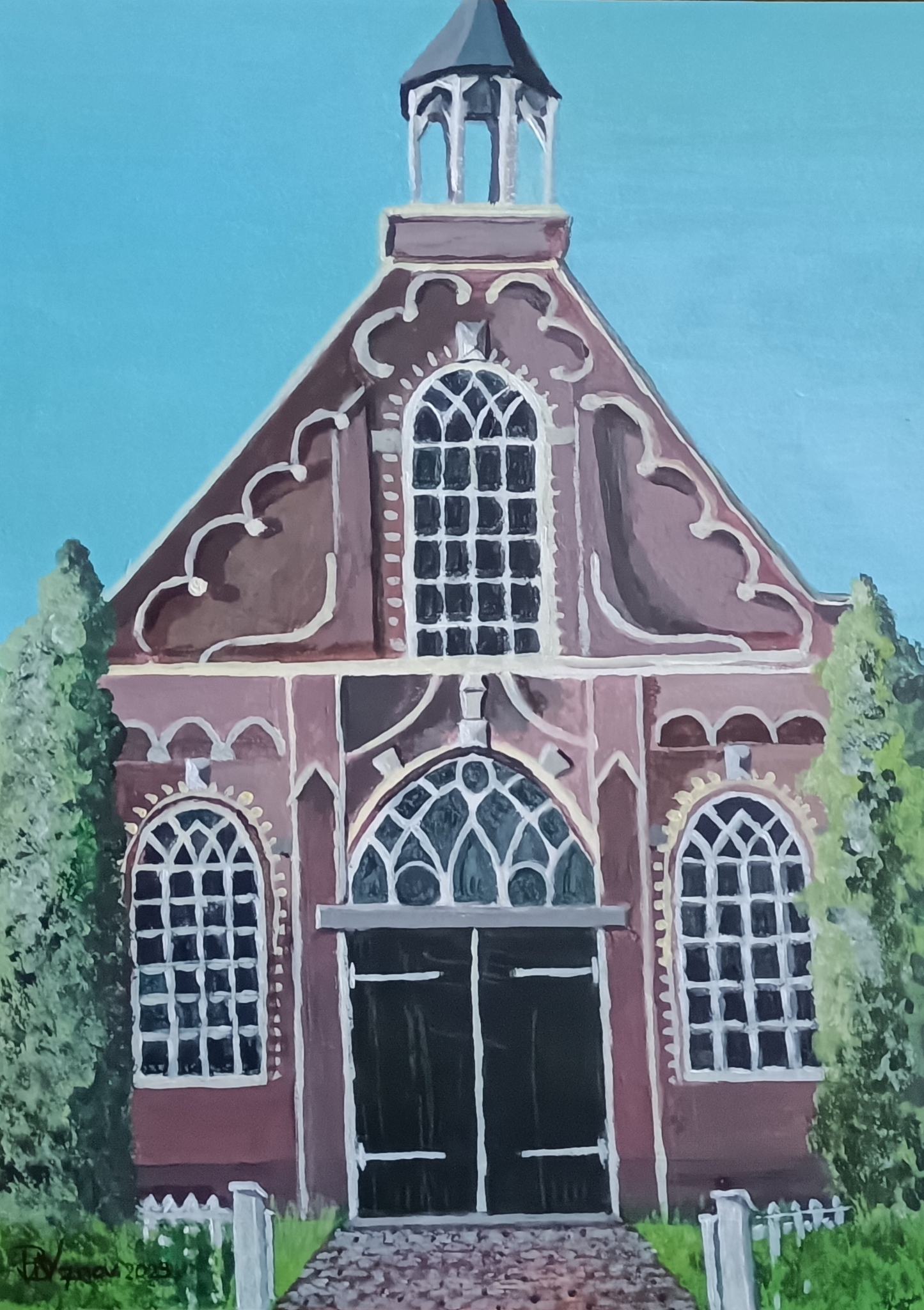 Protestants kerkje in Helmond aan de Kromme Steenweg (rond 1975) acryl op papier zonder lijst afmeting: 30 x 40 cm.