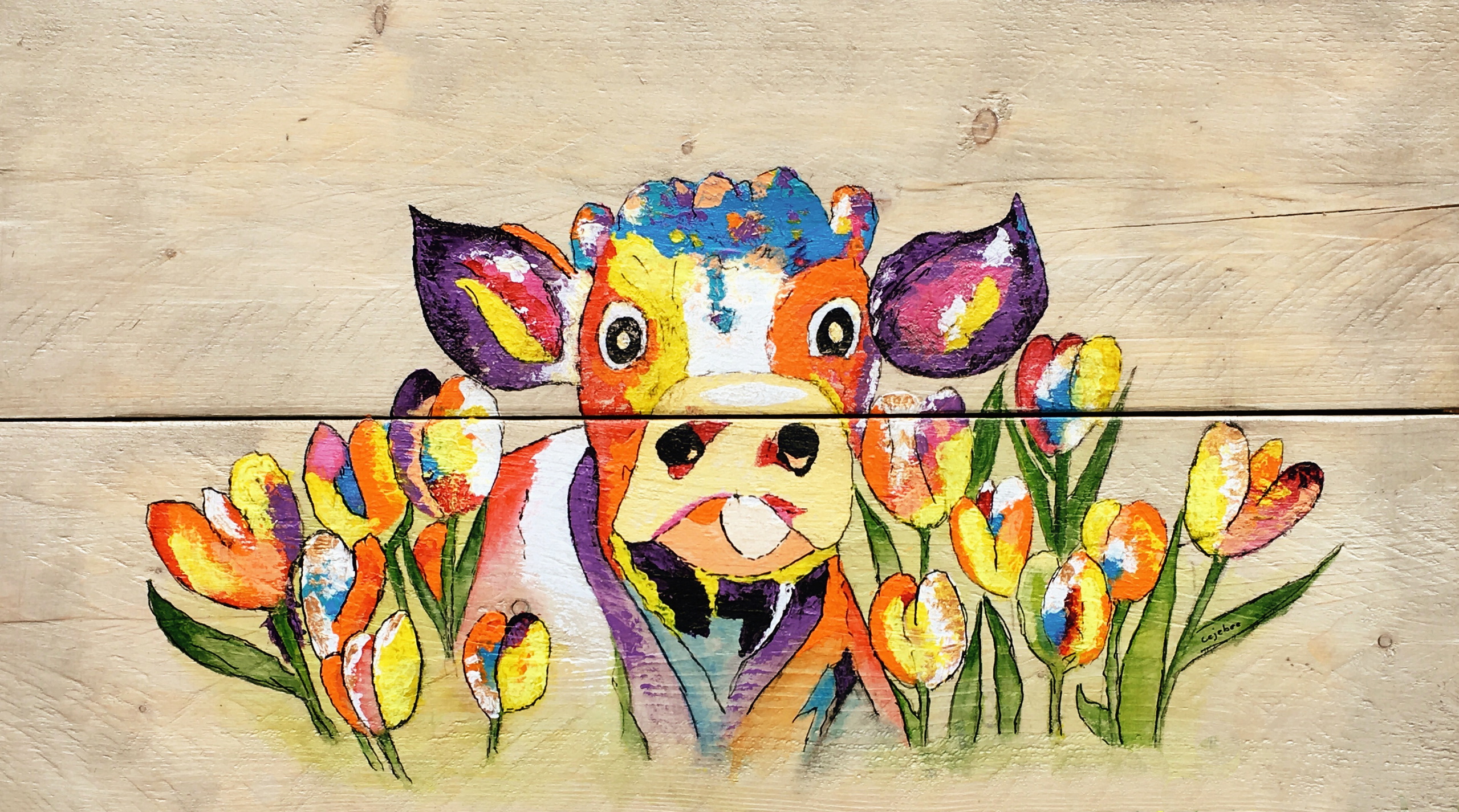 Ik had steigerhout over en vond het leuk deze kleurrijke koe daarop te schilderen. Ik heb het geheel buiten aan mijn voliere gehangen na het te hebben voorzien van een flinke laag blanke lak