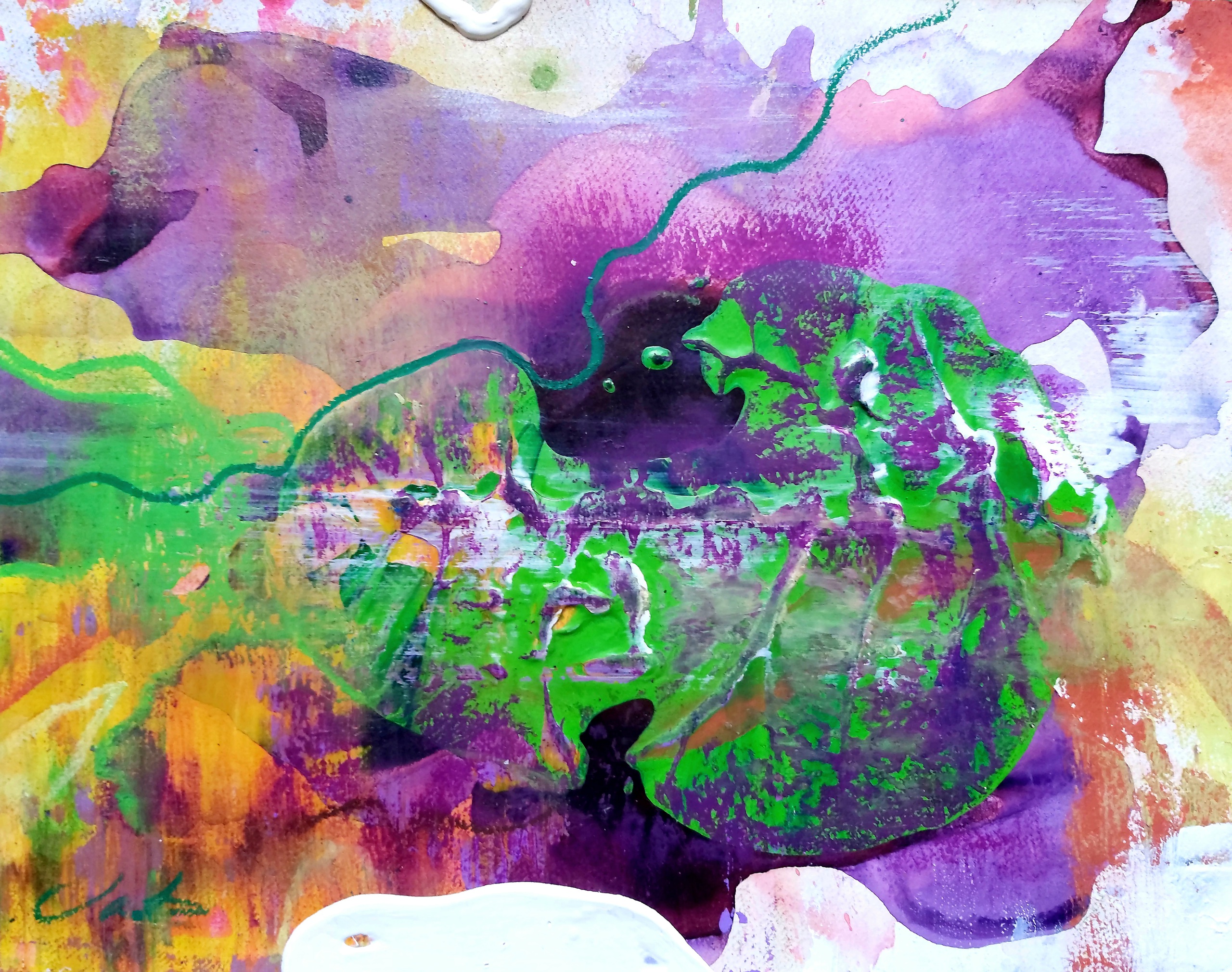 Wit Oranje Acryl Mixed Media Papier Aquarel Op Oliepastel Frog Fantasie Werelden Planeten Geeltinten Groentinten Paarstinten Onderbewustzijn Rim Rosetinten Sterrenstelsels Multiversum Wwwjobcoxextonl