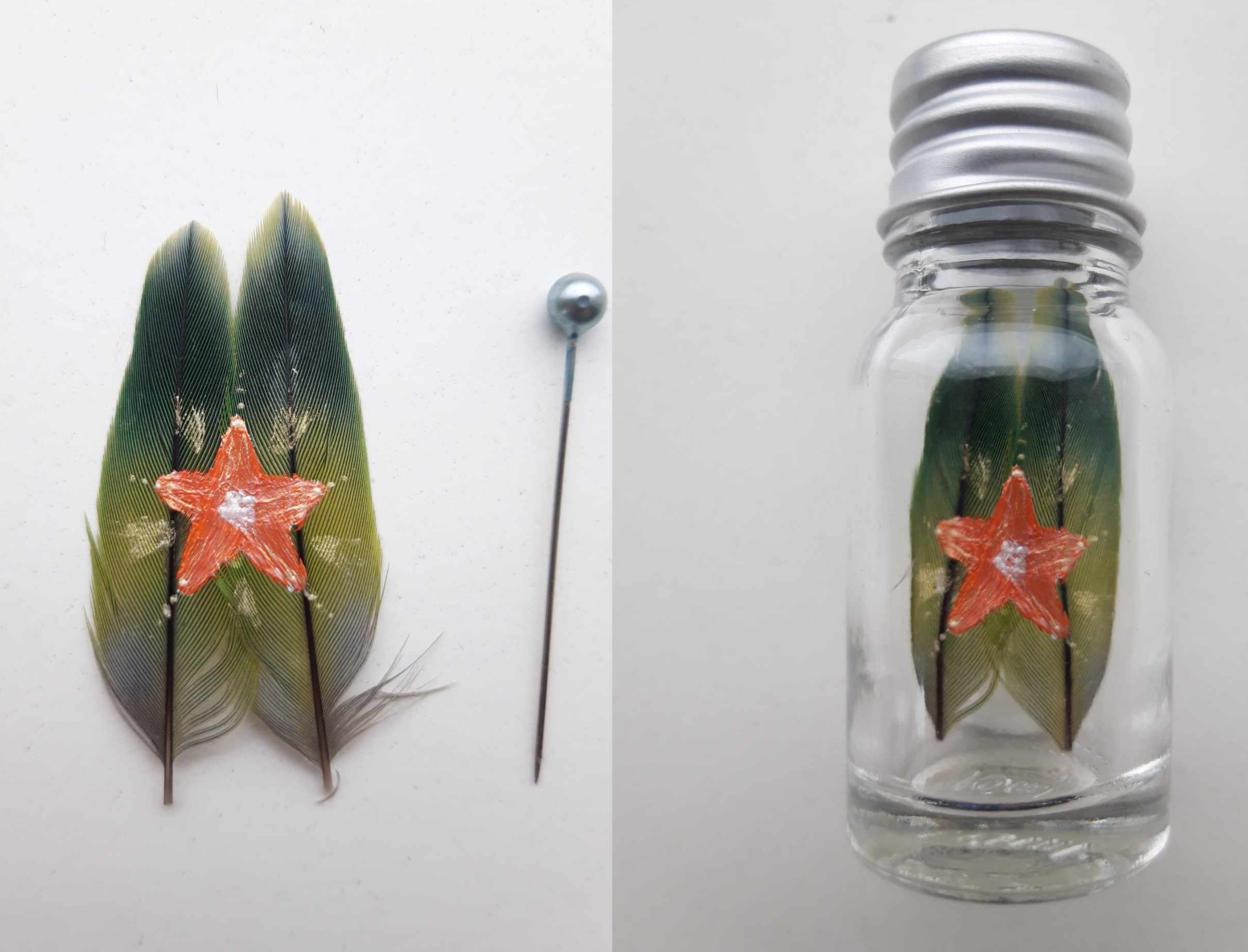 Beschilderde mini veer in glazen flesje. Afmeting van de fles is 6 cm hoog en 2 cm diameter. Er zijn 3 onderwerpen om ervan te kiezen: -Kerstballen . -Ster. -Klok. De achtergrondkleur kan variëren en de kleuren van de op de veren geschilderde onderwerpen kunnen ook variëren om de beste combinatie met de achtergrond kleur ( natuurlijke kleur van de veer) te gebruiken. Prijs is exclusief verzendkosten. Die zijn €7,95 met track and trace binnen Nederland.