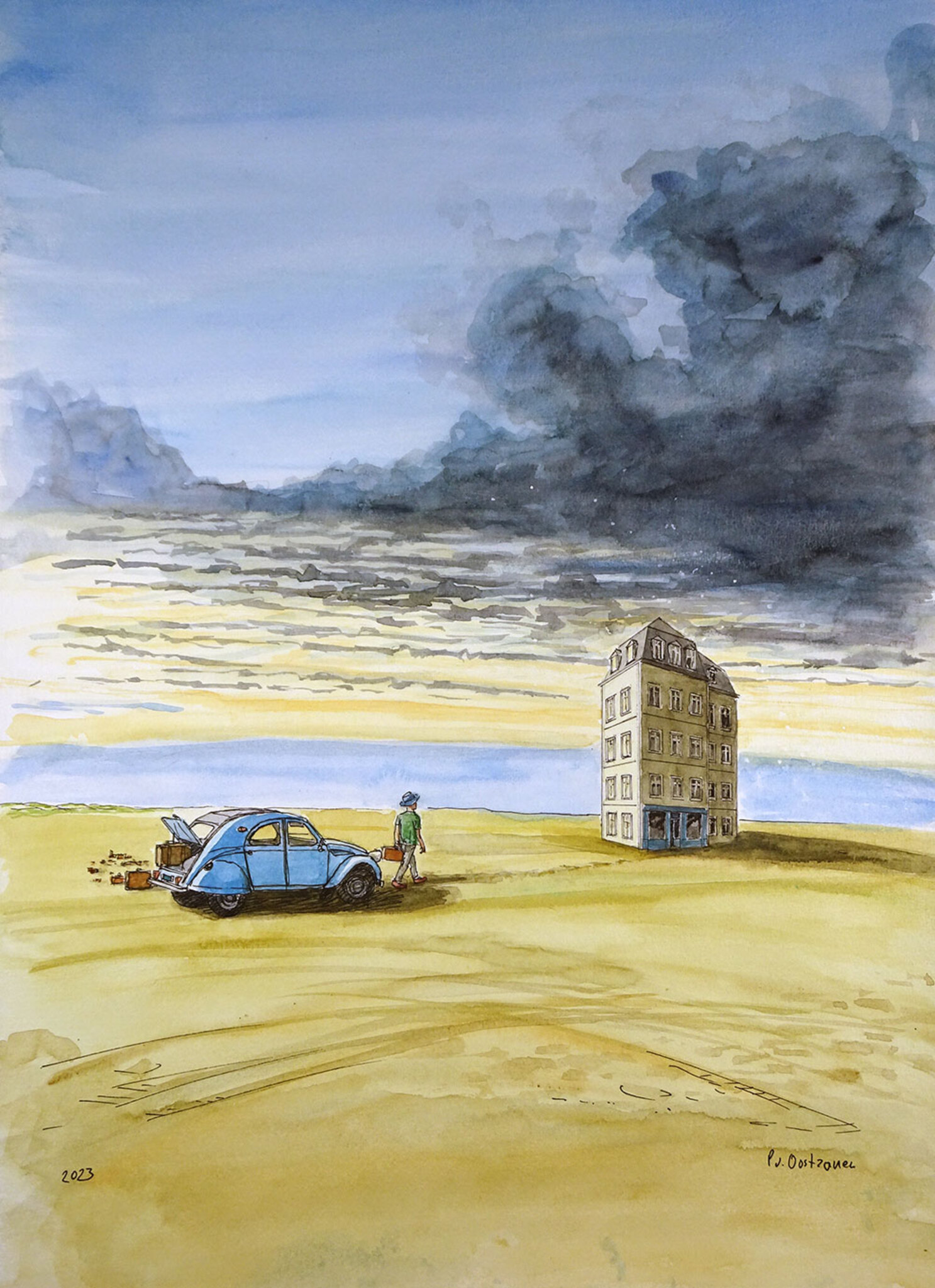 Zelfverzekerd loopt en man van zijn auto naar een verlaten hotel. In zijn hand houd hij een koffer in vast. Achter hen staat een blauwe 2cv geparkeerd. De achterklep staat nog open en om de oude citroën staan koffers in het zand. Er is een pad te zien tussen het hotel en de auto. Voor de rest is er alleen een lege zandvalkte te zien met sporen in het zand. Aquarel gemaakt door van Peter van Oostzanen.
