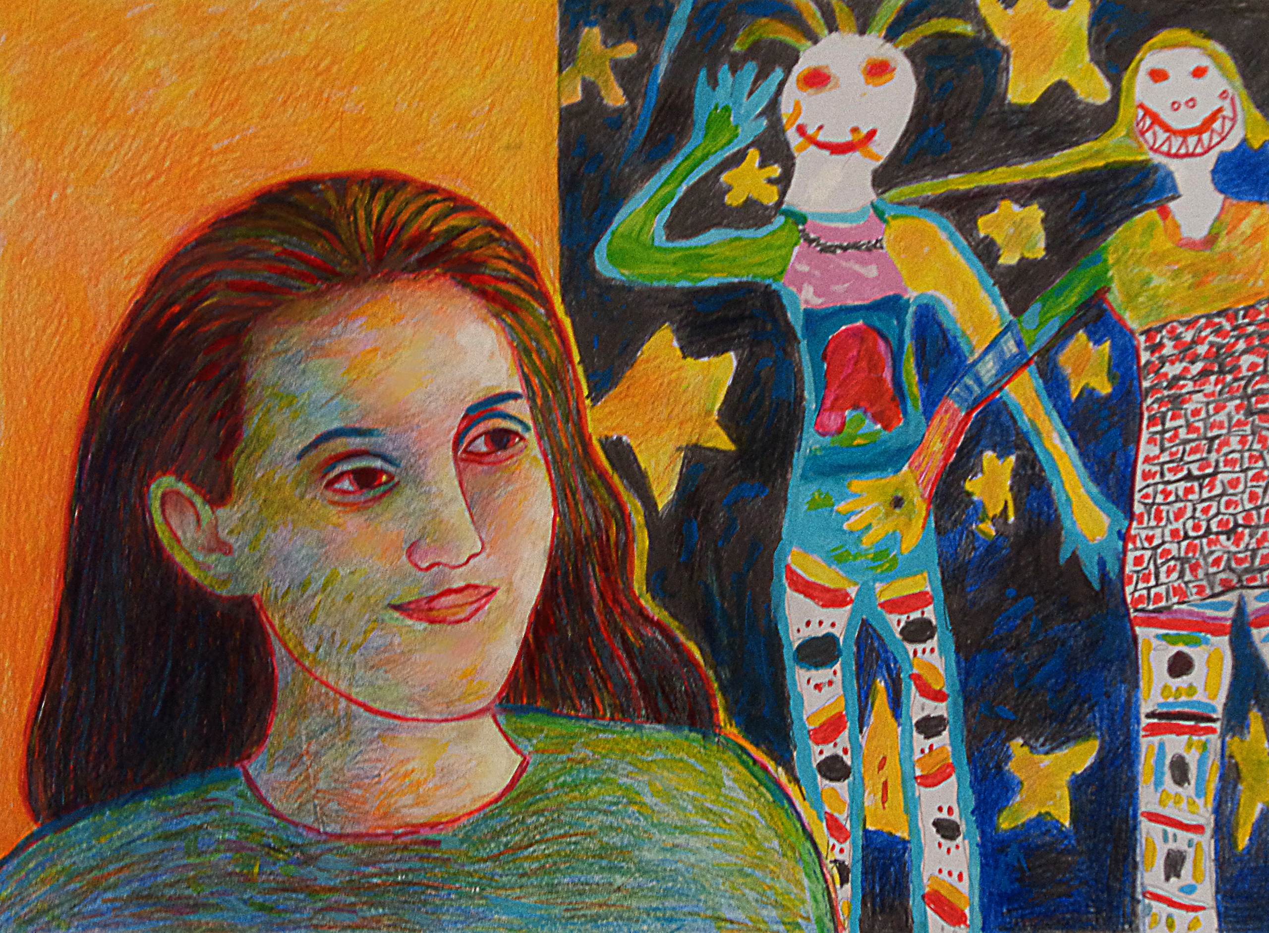 Vrij werk in acrylverf kleurpotlood stift en oliepastel