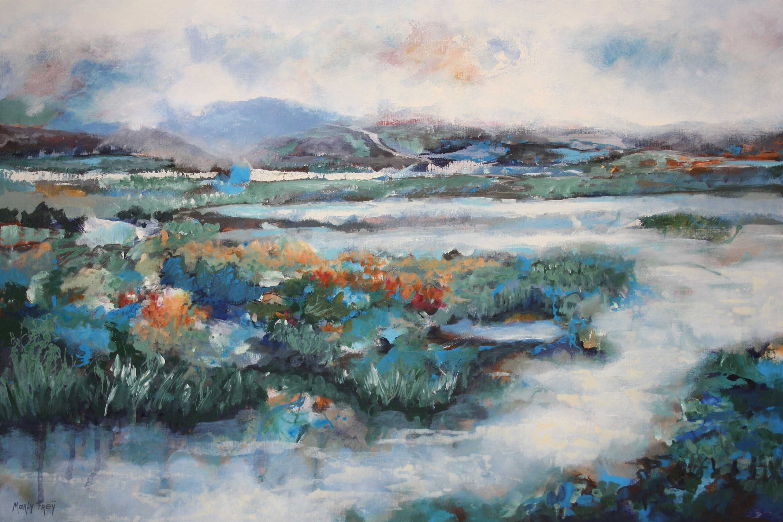 Marly Freij maakt grote kleurrijke, maar ook meer ingetogen schilderijen in gemengde techniek, met name sferische landschappen en abstracte composities