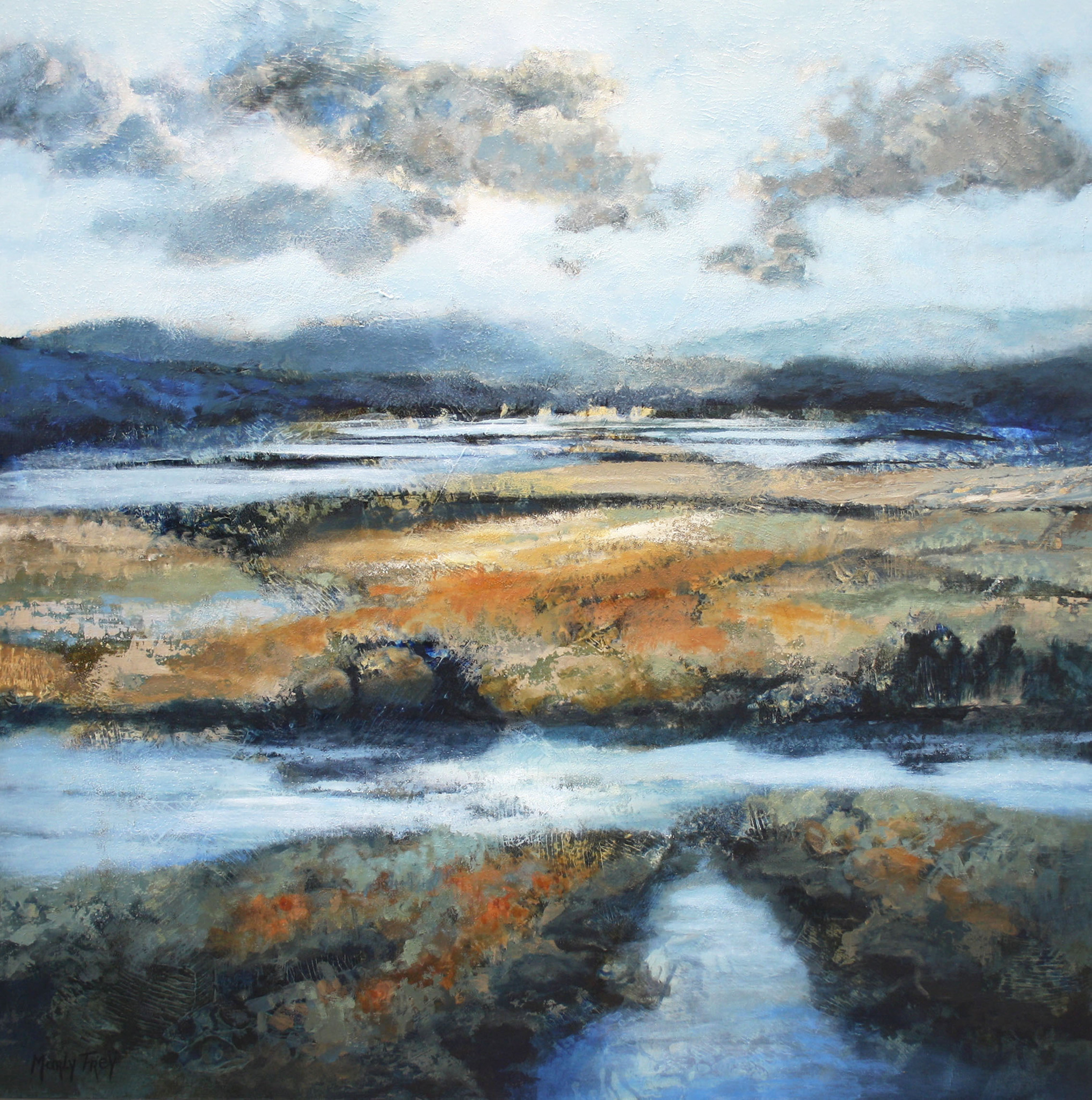 Marly Freij maakt grote kleurrijke, maar ook meer ingetogen schilderijen in gemengde techniek, met name sferische landschappen en abstracte composities