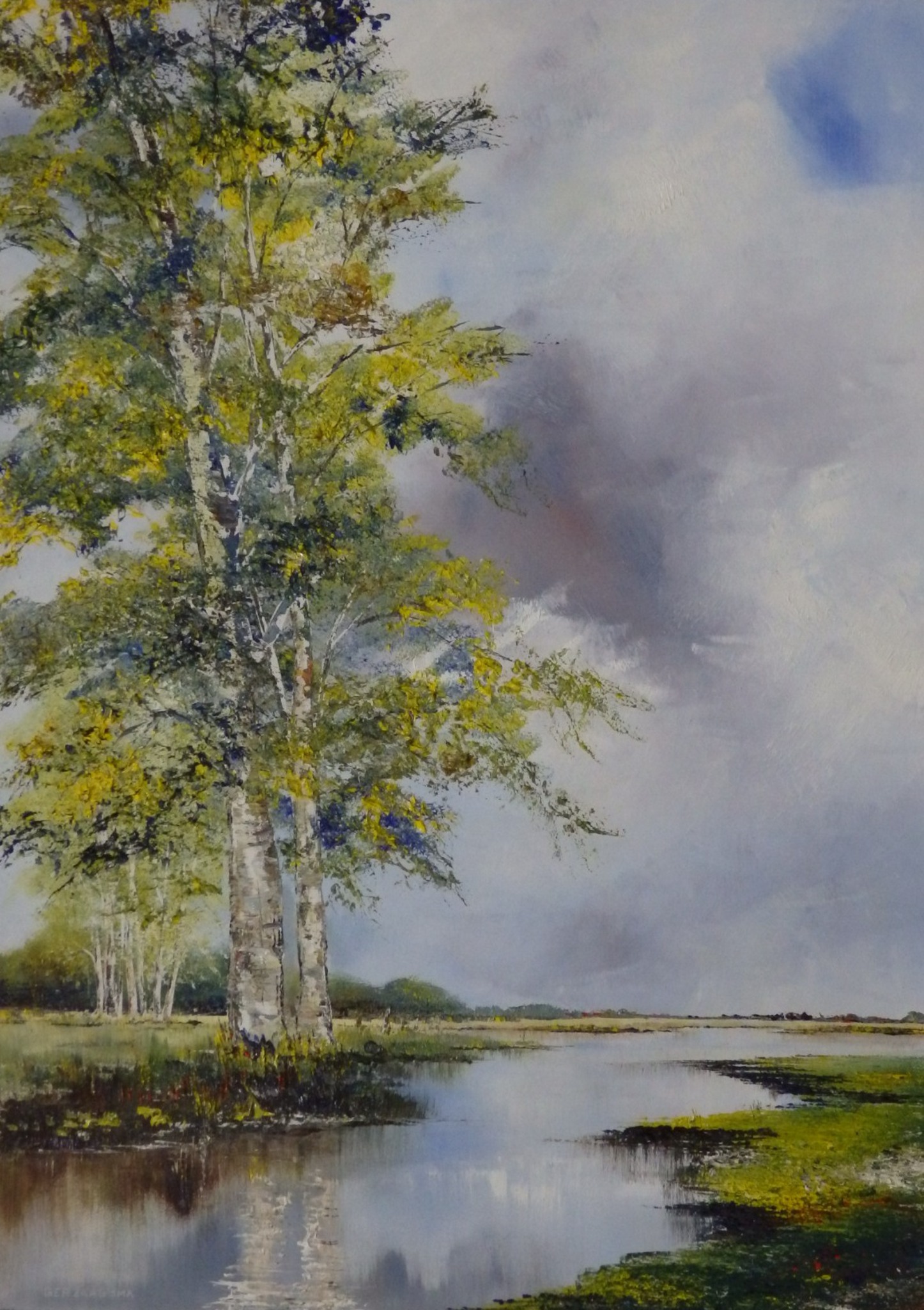 Realistische aquarellen en olieverf schilderijen van Hollands landschap, met altijd expressieve luchten boven de lage horizon zich spiegelend in de waterrijke polder. Ook werken uit de Franse Morvan en van de Oostelijke Algarve in Portugal.