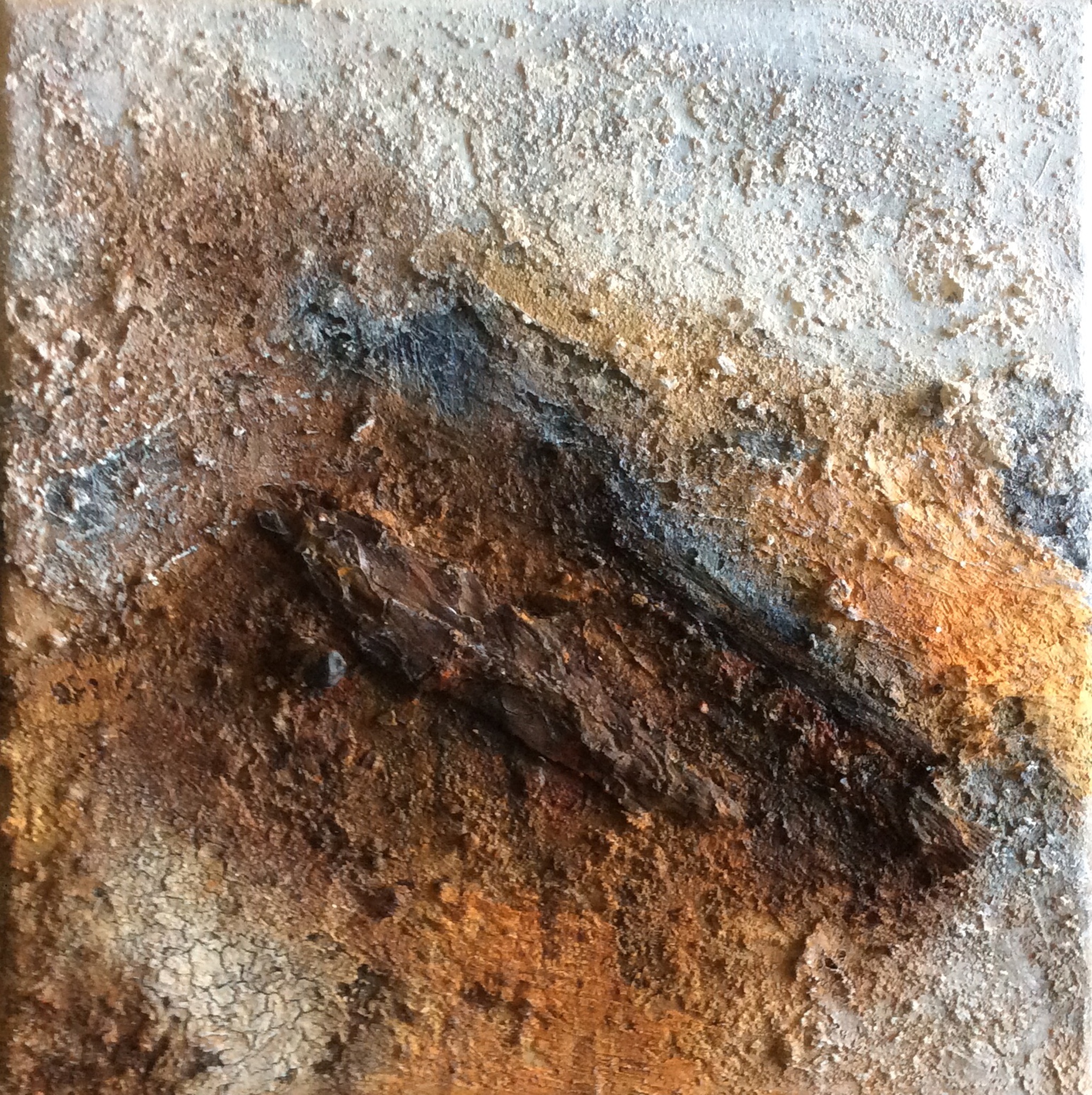 Abstract landschap gecreëerd door gebruik te maken van stukjes hout en andere materialen. Verkocht.