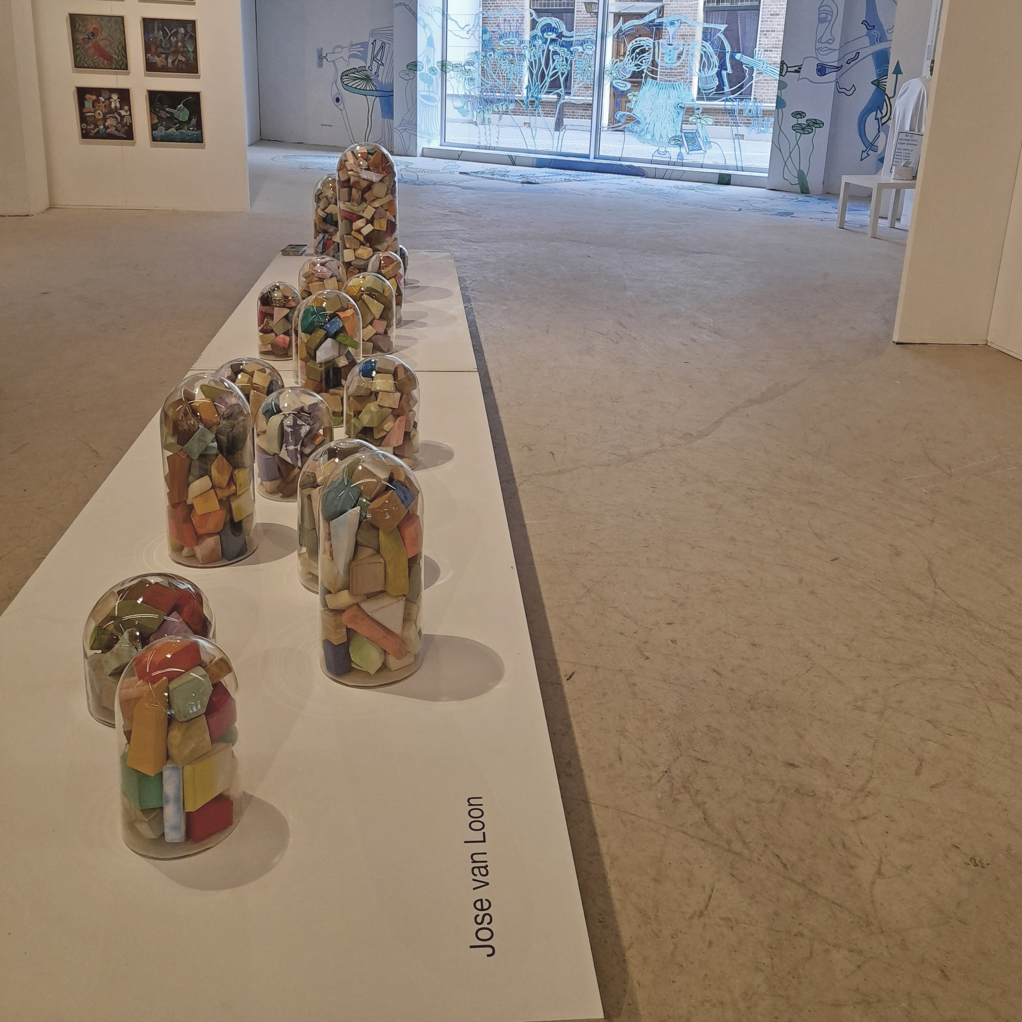 Speciale intallatie opstelling tijdens de Art Brut Biënnale in Hengelo. Deels handgeverfd vilt, borduurzijde, foam, diverse afmetingen (< 10 cm), 11-2017 tot en met heden.