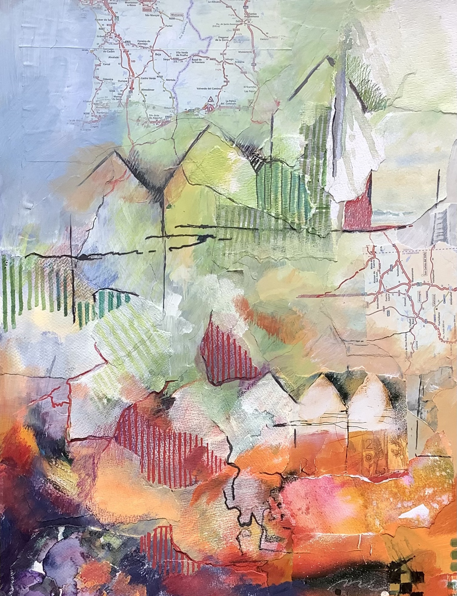 Schilderij Landschap Kleurrijk Geabstraheerd Huizen Landkaarten