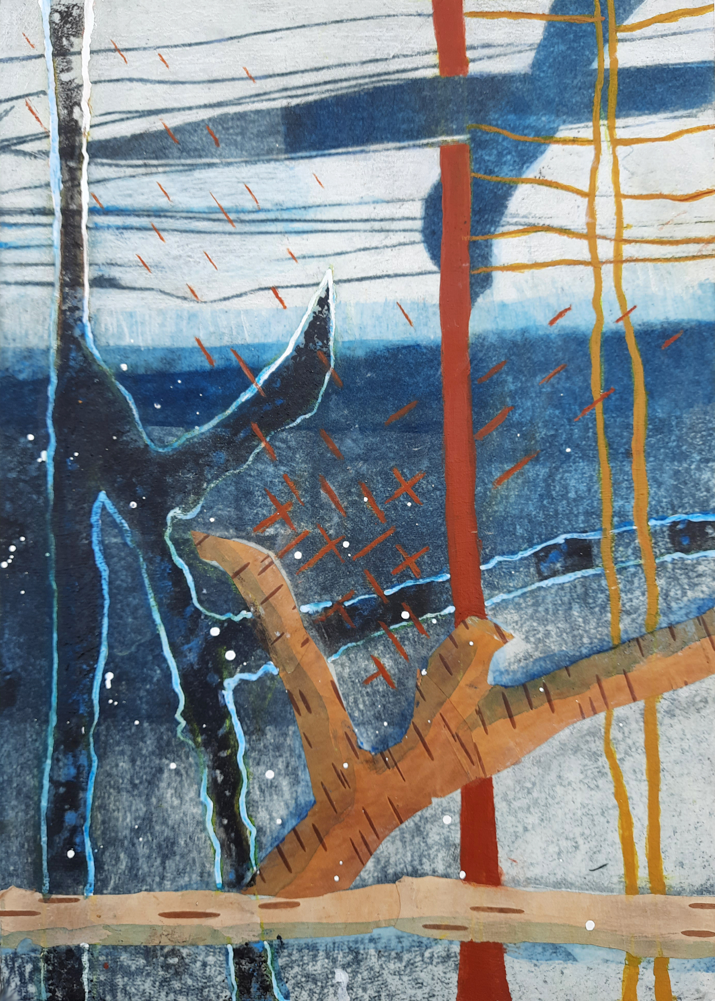 Vlakdruk, berkenbast en acrylverf op houten paneel (dikte 1 cm.)