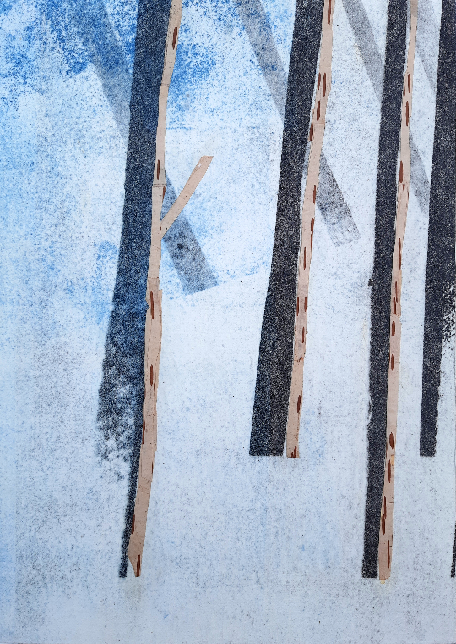 Vlakdruk, berkenbast en acrylverf op houten paneel (dikte 1 cm.)