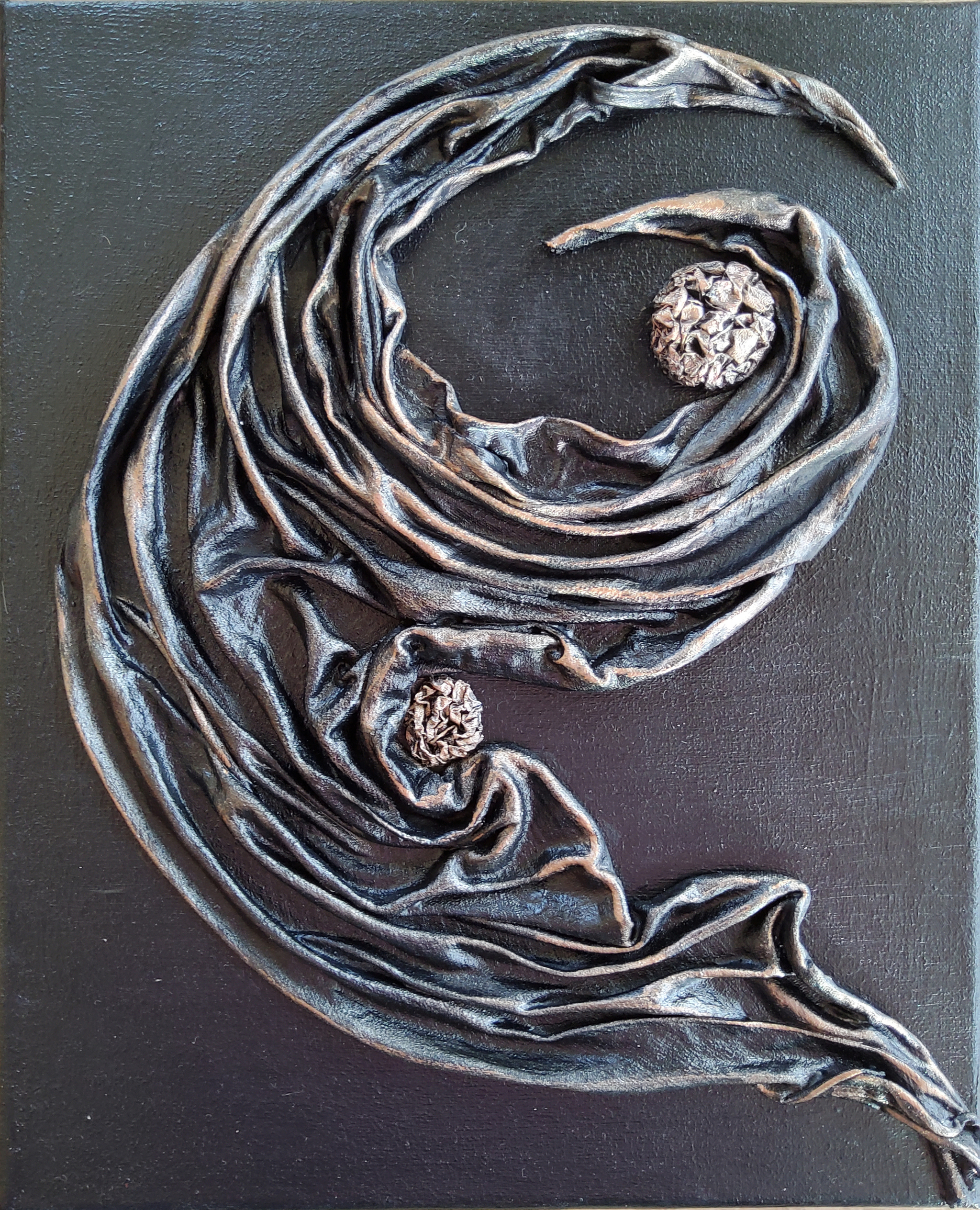 Mijn werk valt niet onder een noemer. Ik maak waar mijn creativiteit mij heen brengt. Vaak maak ik doeken met mixed media. En sinds enkele jaren ben ik ook bezig als edelsmid en ontwerp ik sieraden.