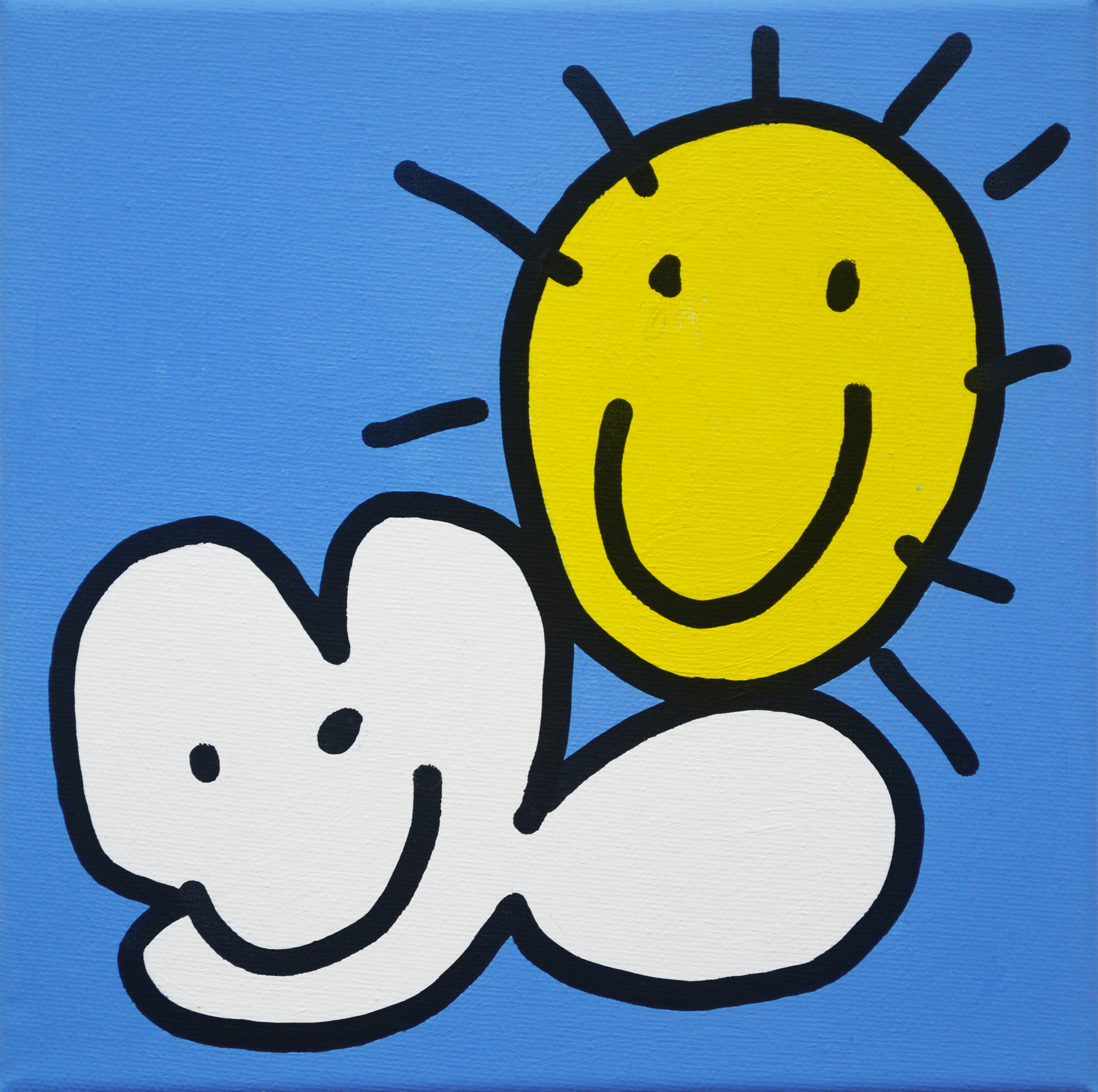 Middels twee kleurvlakken en een zwarte lijn het universum verbeeld; de vriendschap tussen een wolk en de zon. Dit werk is ook inclusief baklijst leverbaar.