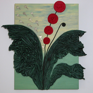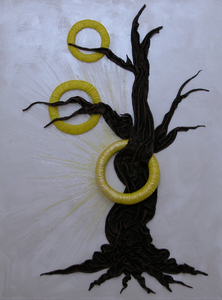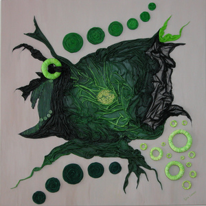 Mijn werk valt niet onder een noemer. Ik maak waar mijn creativiteit mij heen brengt. Vaak maak ik doeken met mixed media. En sinds enkele jaren ben ik ook bezig als edelsmid en ontwerp ik sieraden.