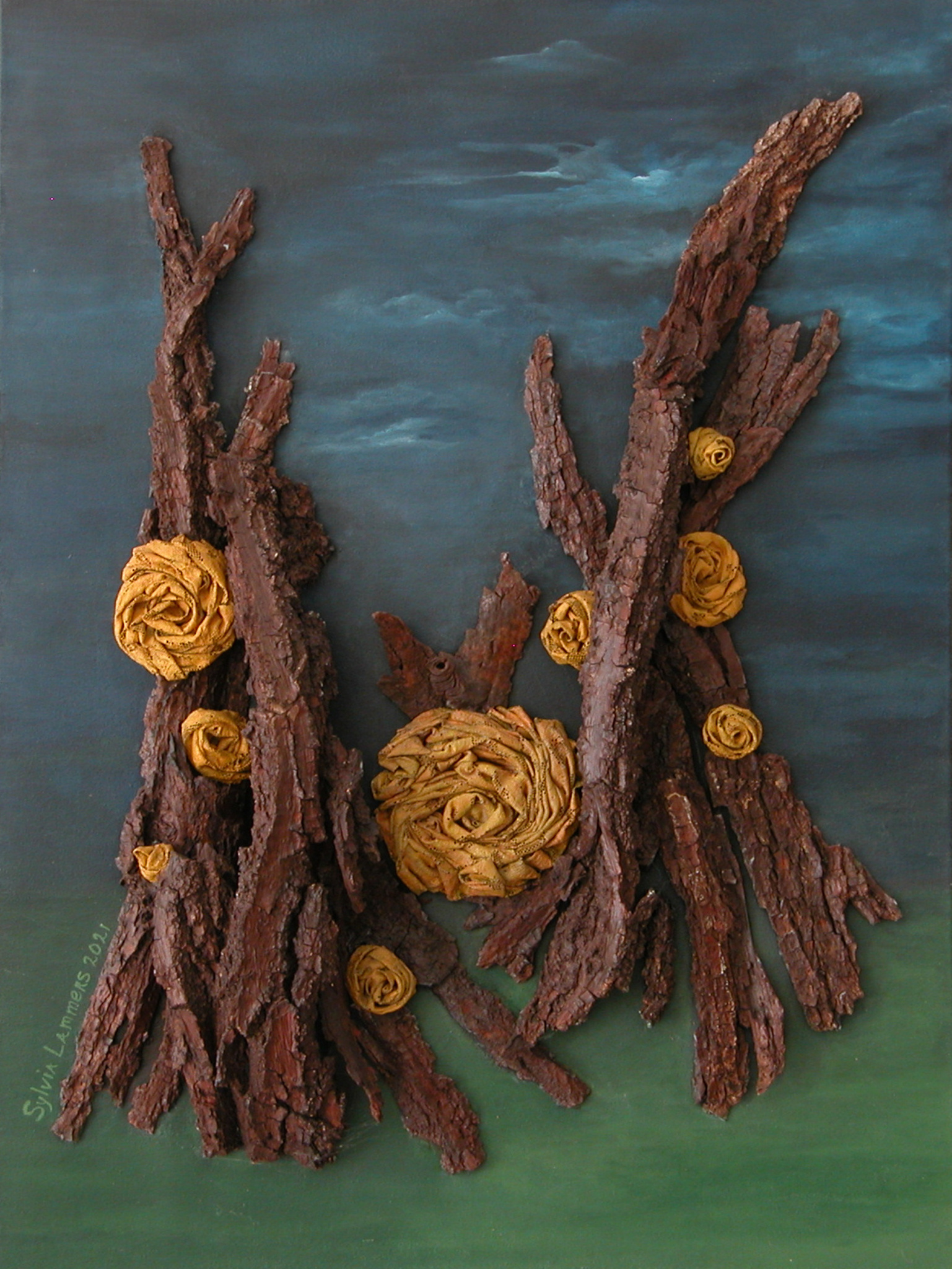 Mijn werk valt niet onder een noemer. Ik maak waar mijn creativiteit mij heen brengt. Vaak maak ik doeken met mixed media. En sinds enkele jaren ben ik ook bezig als edelsmid en ontwerp ik sieraden.