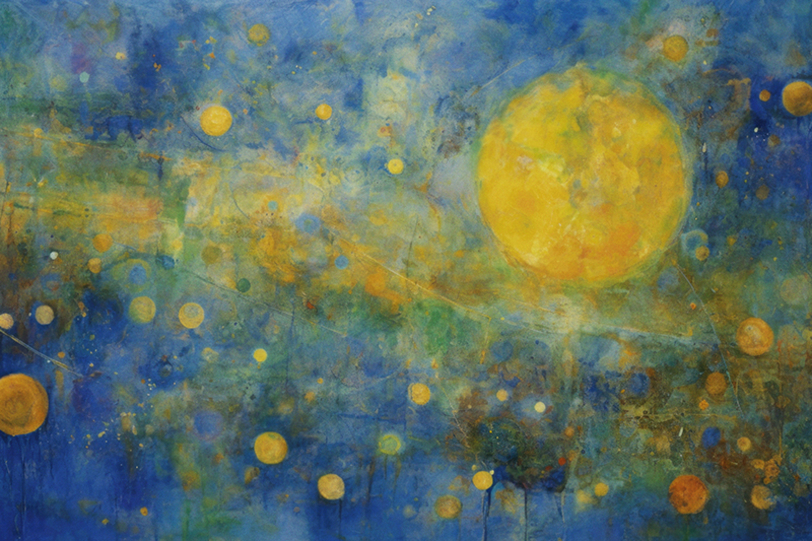 Abstract, sterrennacht. Zachte kleuren en vervaagde natuurbeelden, mooie herinneringen. De details werden bewust vervaagd om de nadruk te leggen op de emotie en herinnering aan het moment, eerder dan op een exacte weergave van de natuur. Herinnering aan de prachtige momenten in de natuur die ons kunnen kalmeren en inspireren, zelfs wanneer ze vervagen in de verte van onze herinneringen.