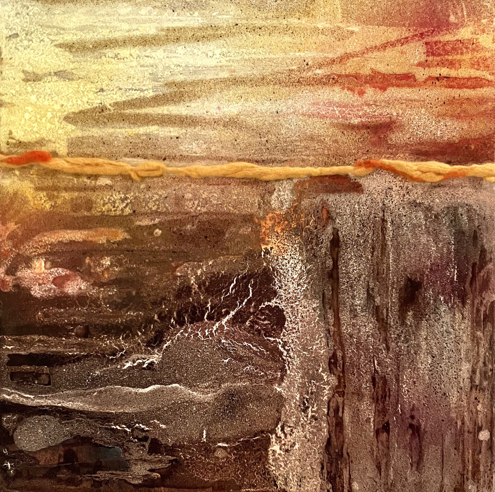 een opdracht: als onderdeel van tweeluik met Over leven (uit 2021) Een vilten strook loopt over het schilderij; deze is door mij gevilt.