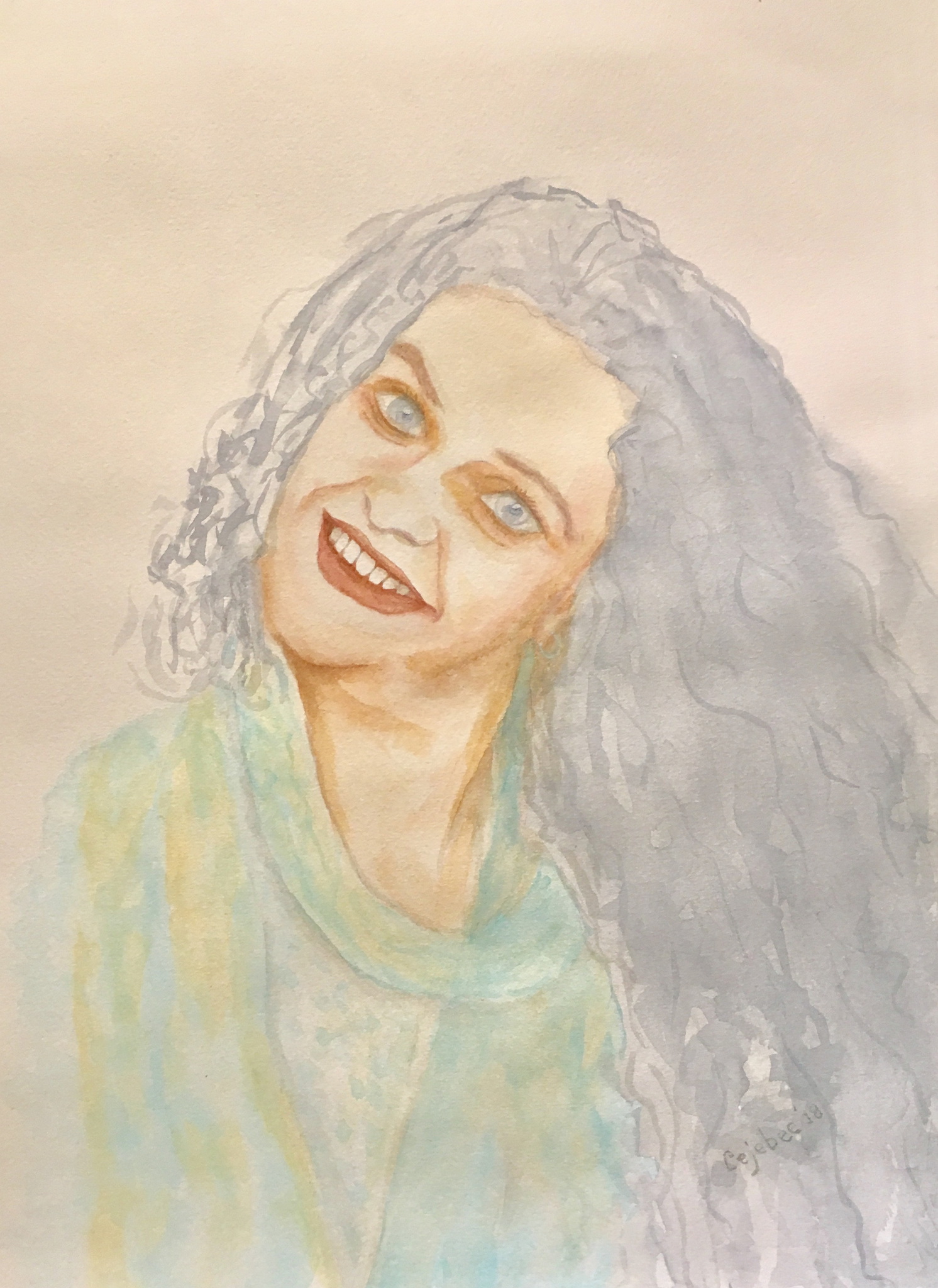 Weer een geliefd familielid. Onze dochter met los, lang haar. Eens kijken of het lukt om daar een aquarel van te maken. Gelukt, vind ik en ze lijkt prima.