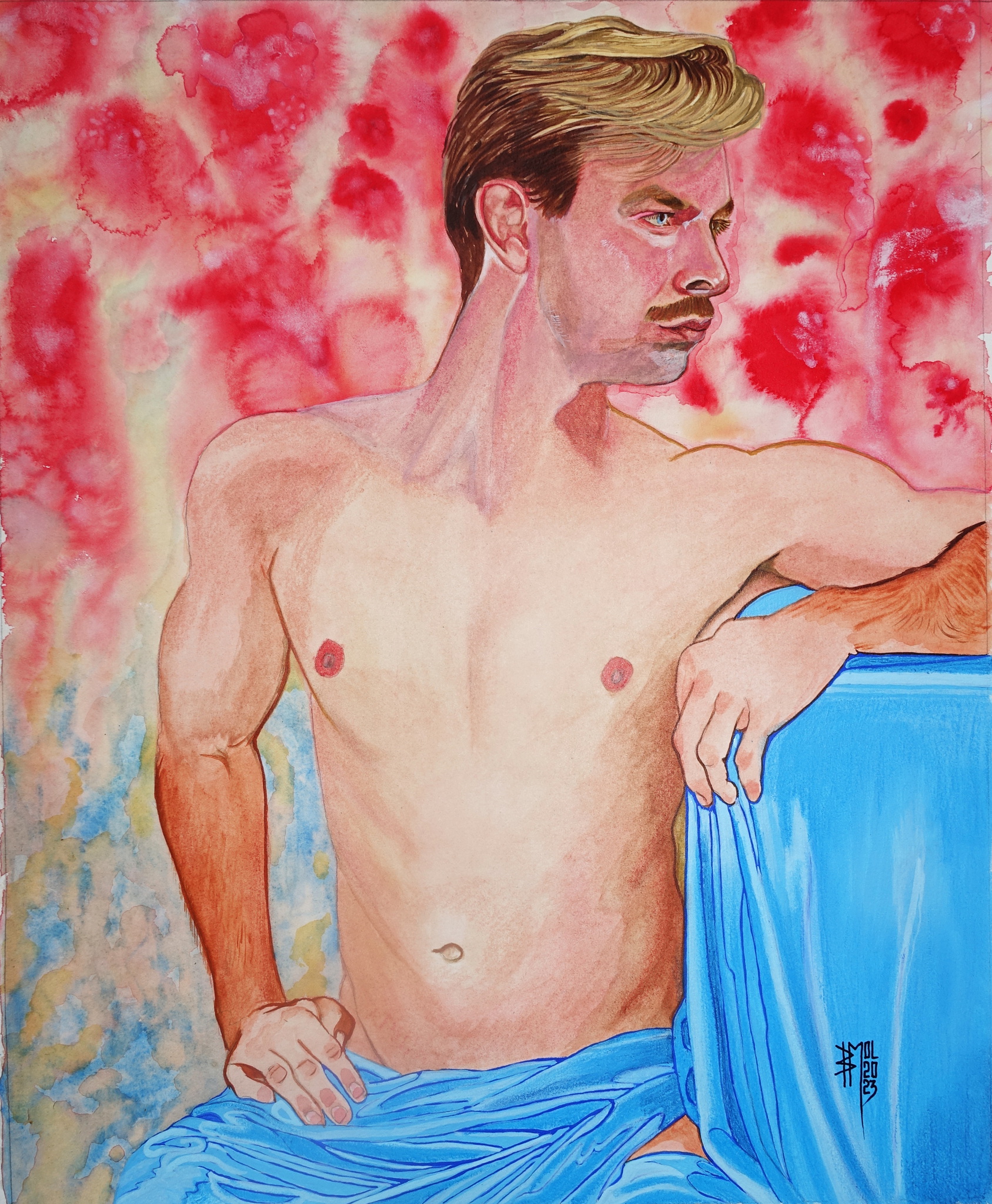 one of my models ,Mark W. this is the first portrait of him after his posing , Nov-2023 . watercolours , gouache and softpastels on cottonpaper .