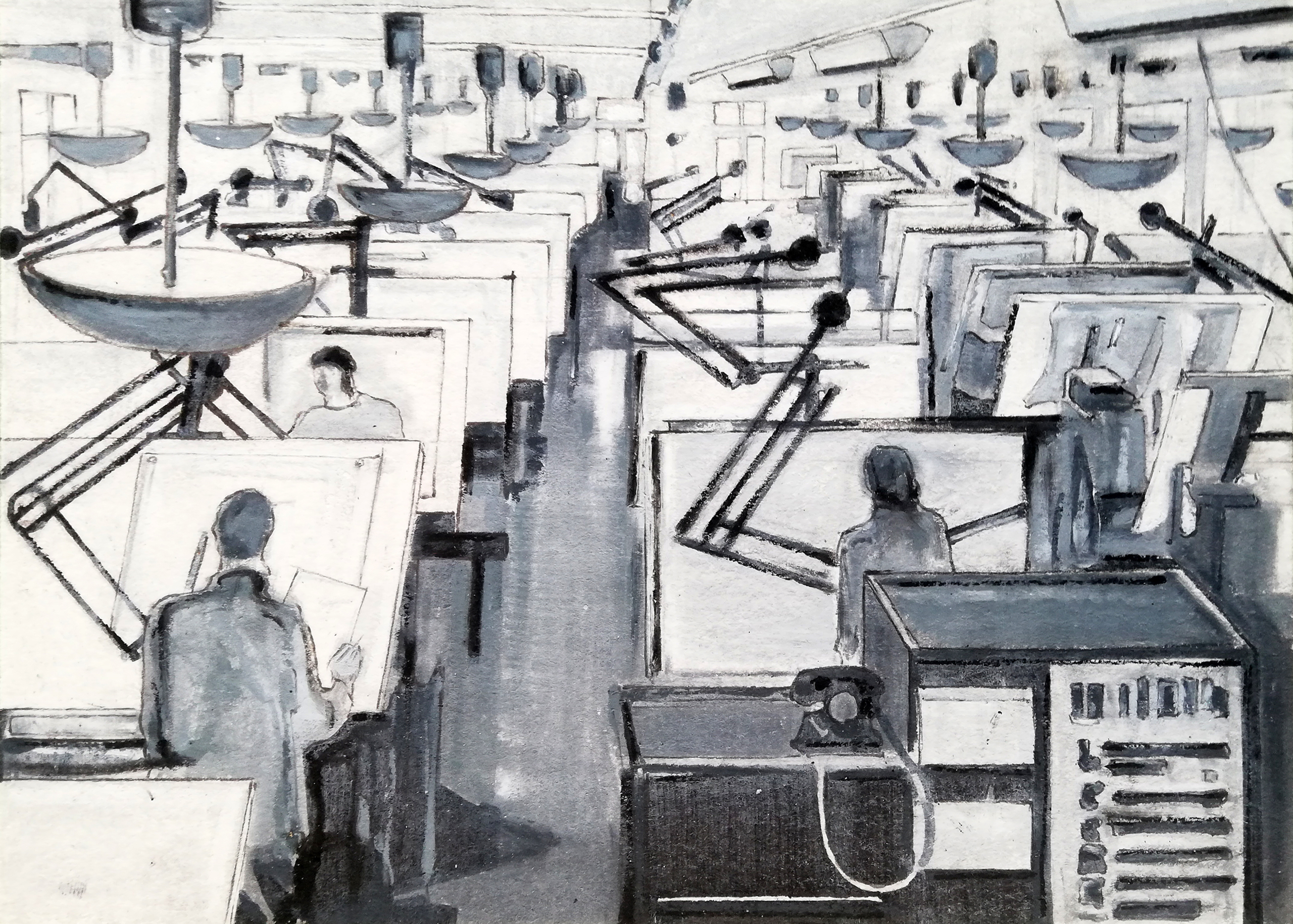 Een groep architecten en ontwerpers, aan het eind van de twintigste eeuw in een anoniem kantoor. Onderdeel van de serie "the powers that be".