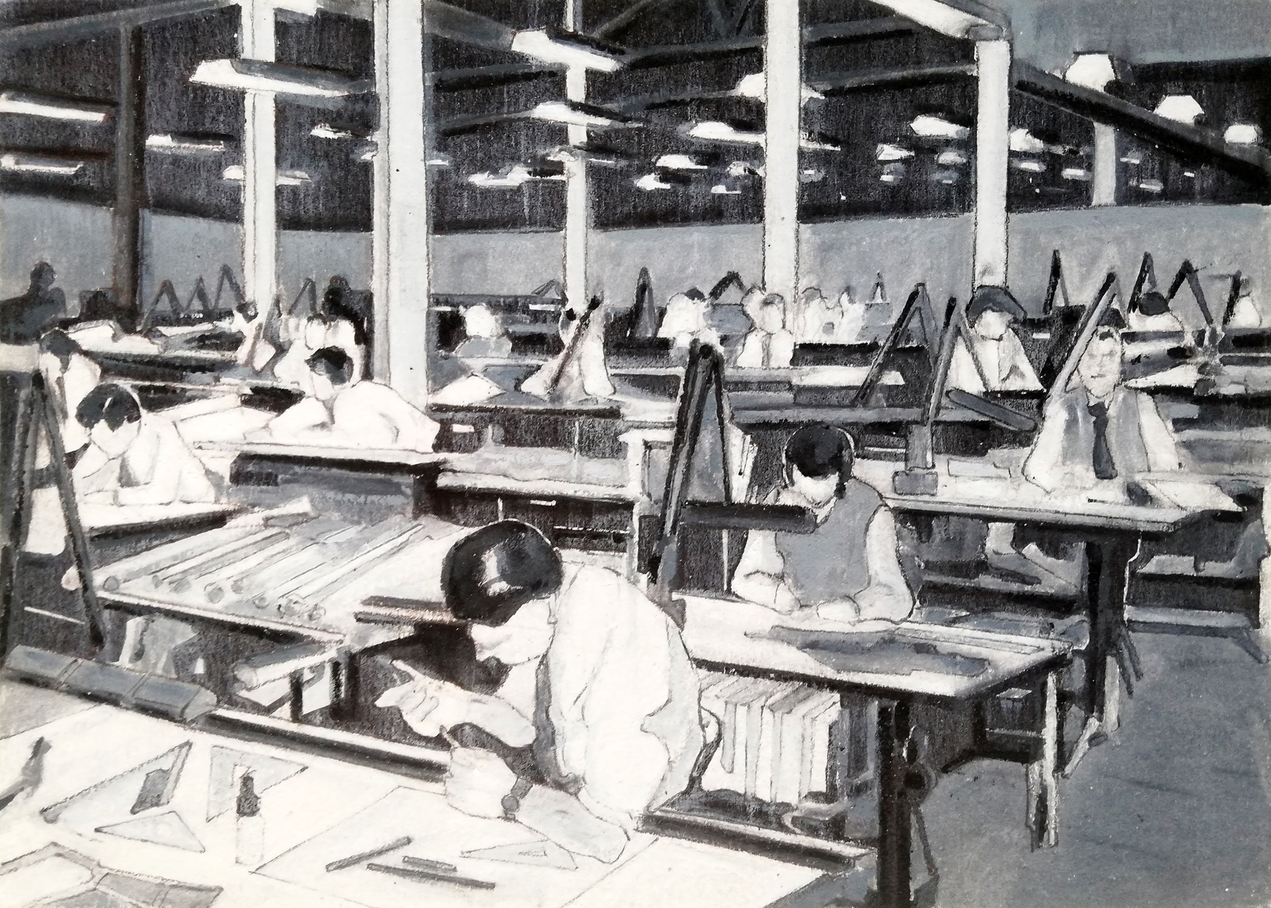 Een groep architecten en ontwerpers, aan het eind van de twintigste eeuw in een anoniem kantoor. Onderdeel van de serie "the powers that be".