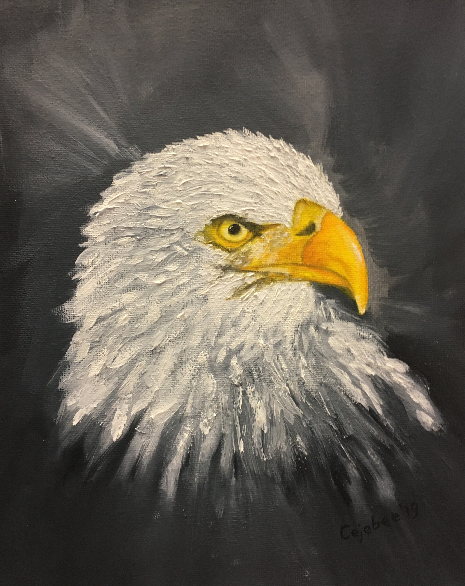 Weer een ander formaat doek, dit keer kleiner. Weer ruwer geschilderd in olie. Dit keer een zeearend. Aardig gelukt, al zeg ik het zelf.