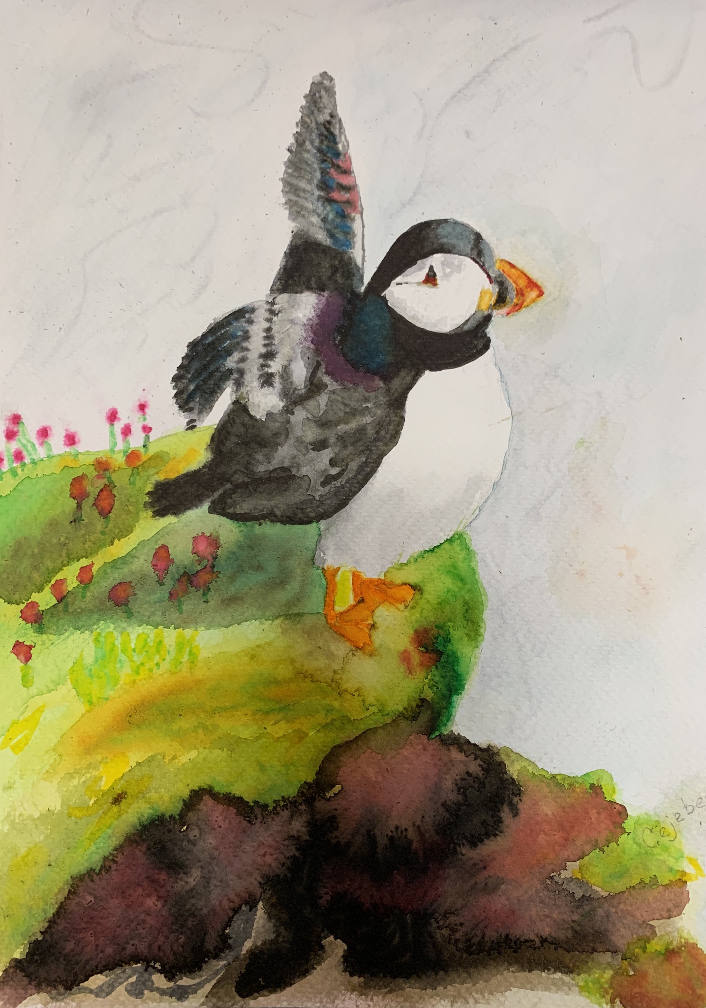 Wederomk een uitprobeersel. Hoe werken ecolinestiften? Ik had geen idee. Ik kreeg een voorraadje stiften voor vaderdag en ging er mee aan de slag met een papegaaiduiker als voorbeeld. Het viel me best tegen, maar ik kreeg iets leuks op papier.