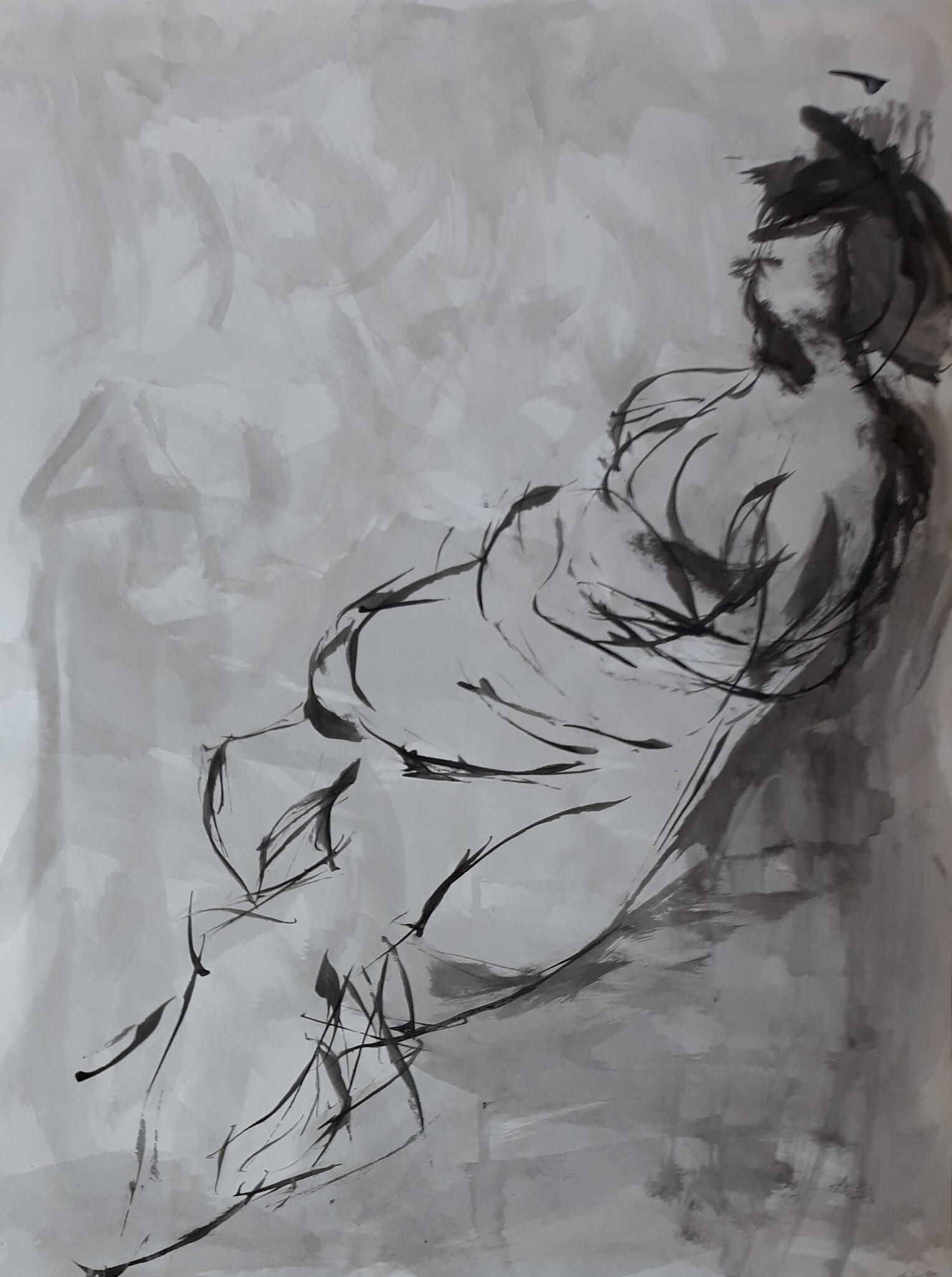 1 naaktmodel in gewassen inkt naar waarneming. Getekend met satéstokje in lijst achter glas.