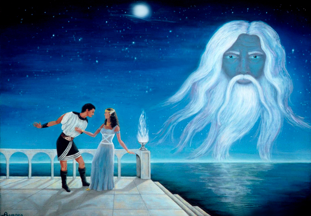 Schilderij God Art Water Oil Olieverf Kunst Painting Nacht Dancing Wijsheid Vuur Dansen Sterren Fire Stars Night Eeuwig Couple Geliefden Ea Wisdom Eternal