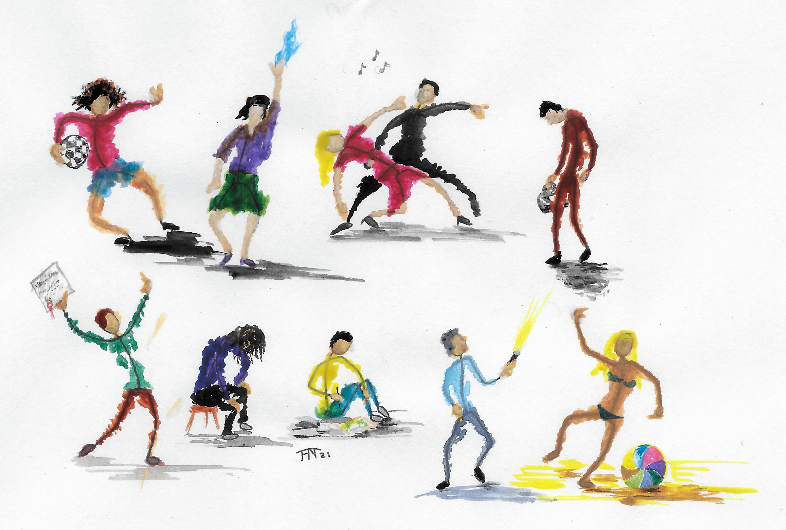 Over de lucifer poppetjes wordt met gekleurde aquarelverf geschilderd. Het verhaal moet erg duidelijk zijn.