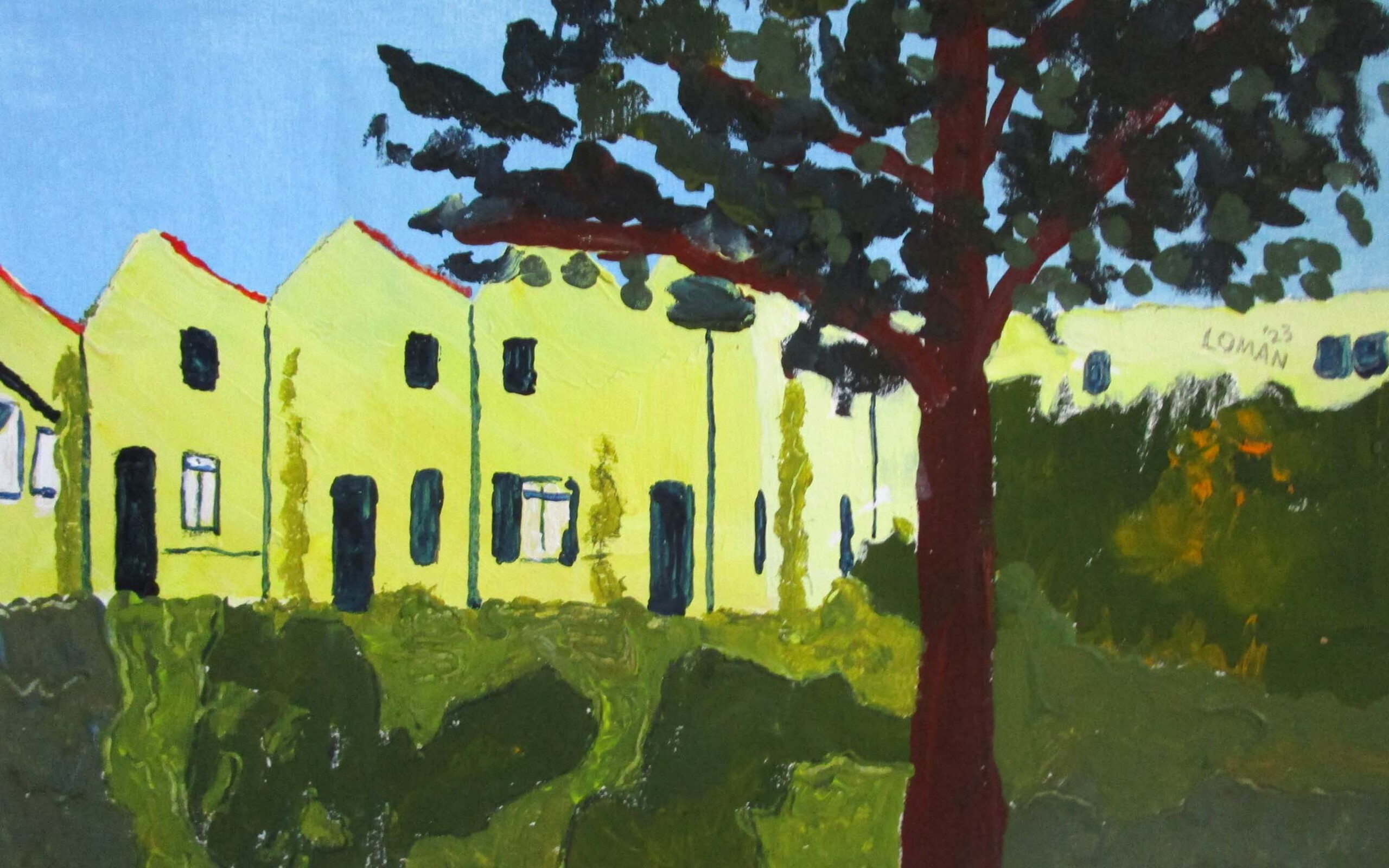 Geel Blauw Groen Bruin Lucht Boom Huizen Struiken
