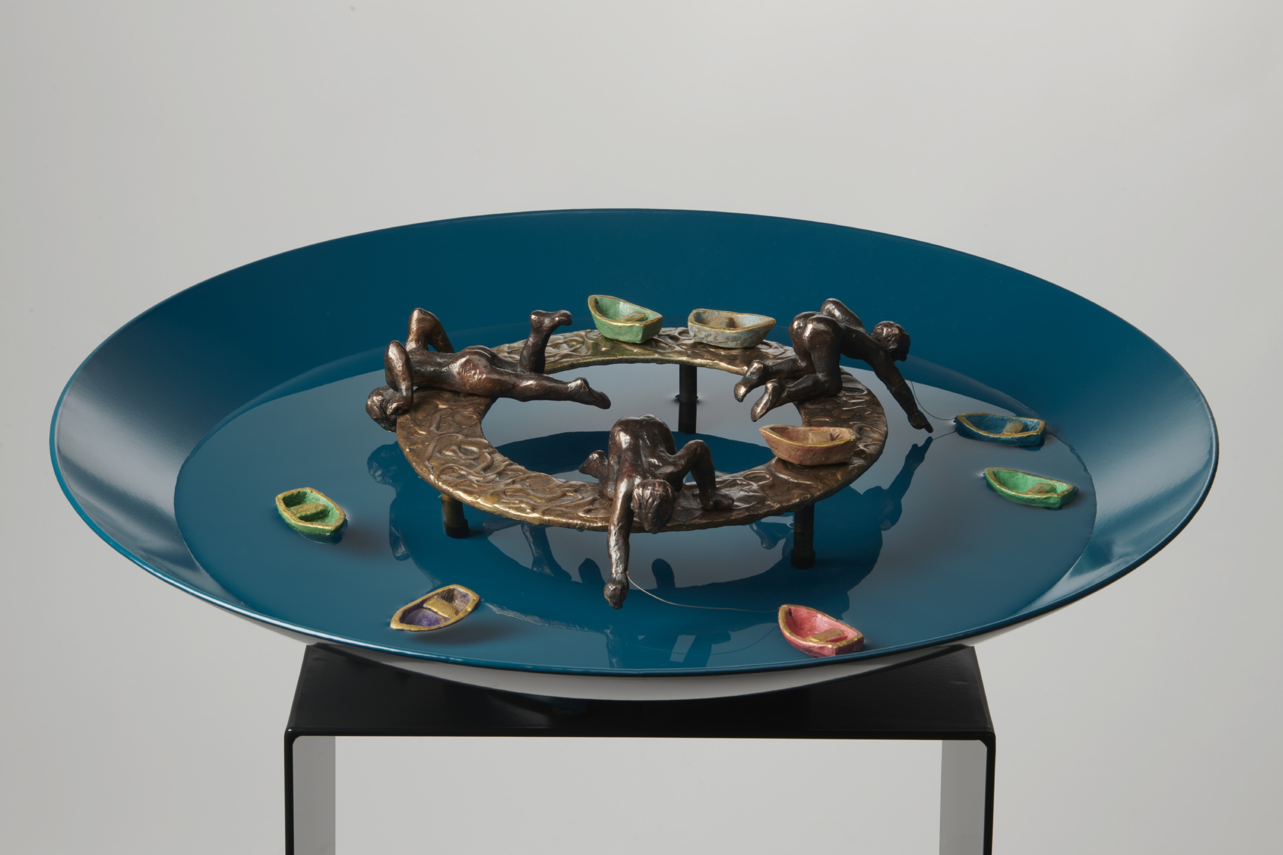 Drie kinderen spelen met een aantal bootjes. Bronzen beeld in een waterschaal. De drijvende bootjes zijn gemaakt van kunsthars,
