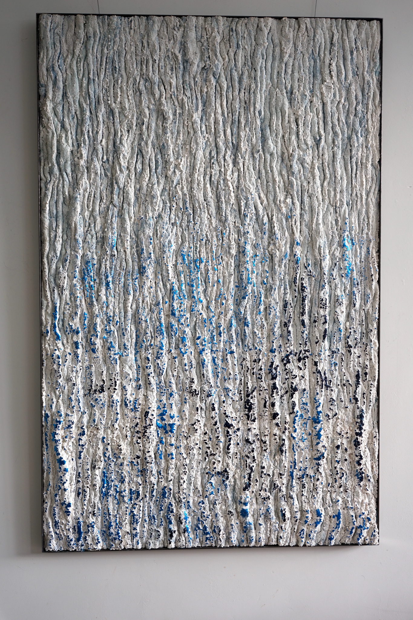 Vilt op ambachtelijke wijze gemaakt. Daarna bewerkt met naald en draad om structuur tekrijgen. En daar overheen verf en folie. In ijzere lijst.