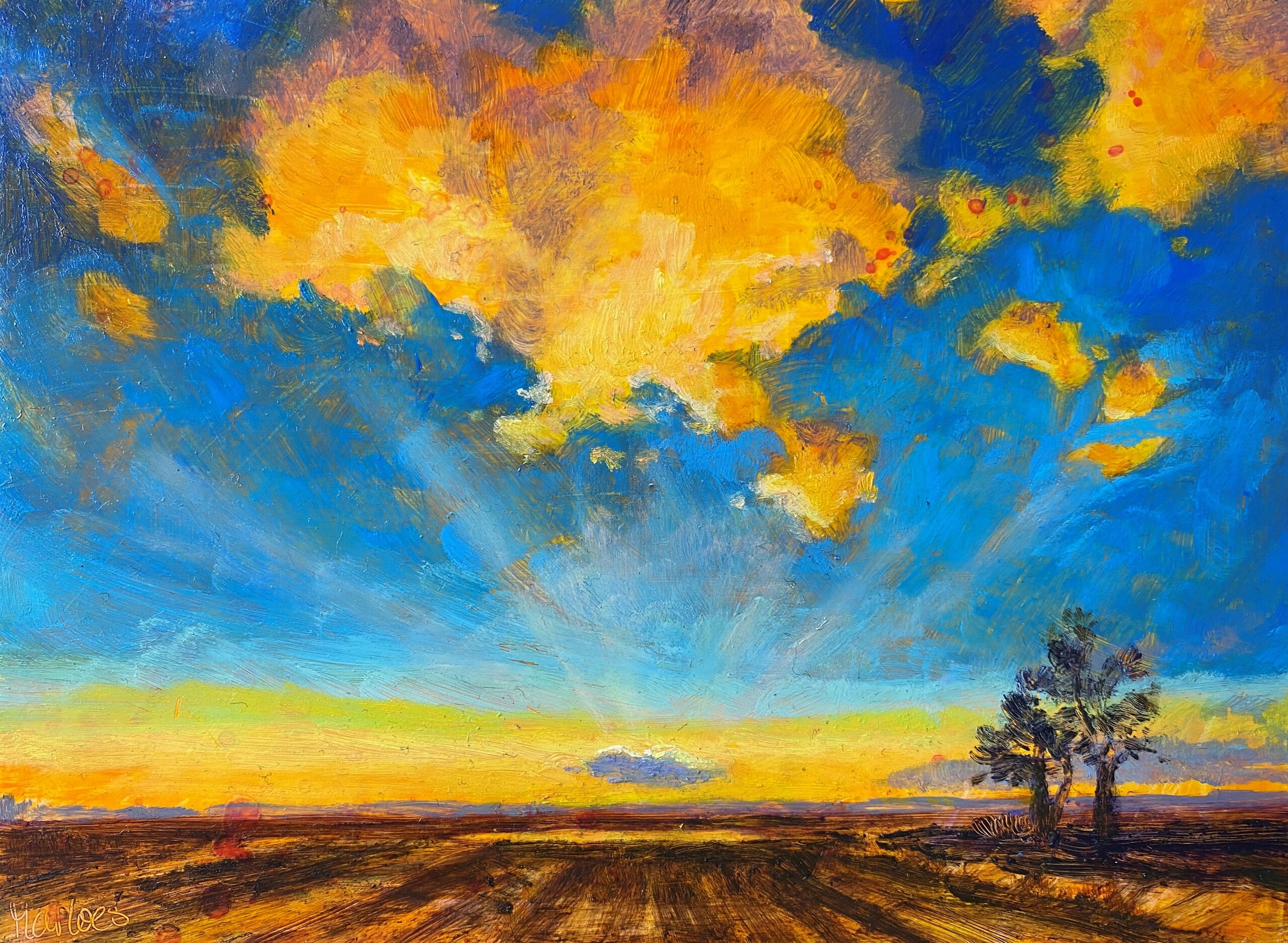 Schilderij Zon Oranje Geel Landschap Blauw Twee Bruin Licht Olieverf Bomen Love Lucht Aarde Landscape Wolk Zonnestralen Verbinding Connection Channel Lichtwerker Doorgeven Marloesbuigelboering