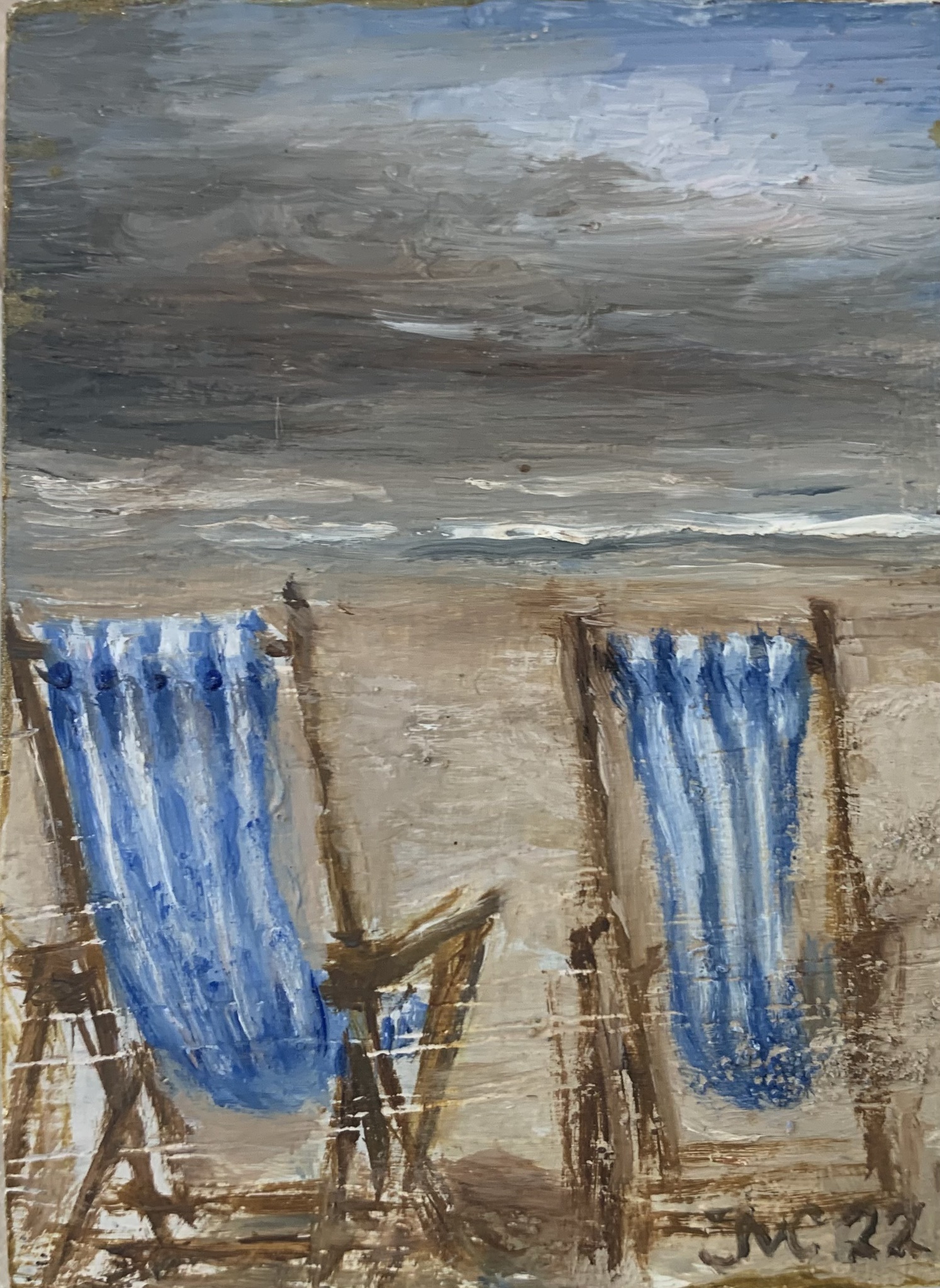 Figuratief Romantisch Zomer Gestreepte Impressionistisch Strandtafereel Strandstoeltjes