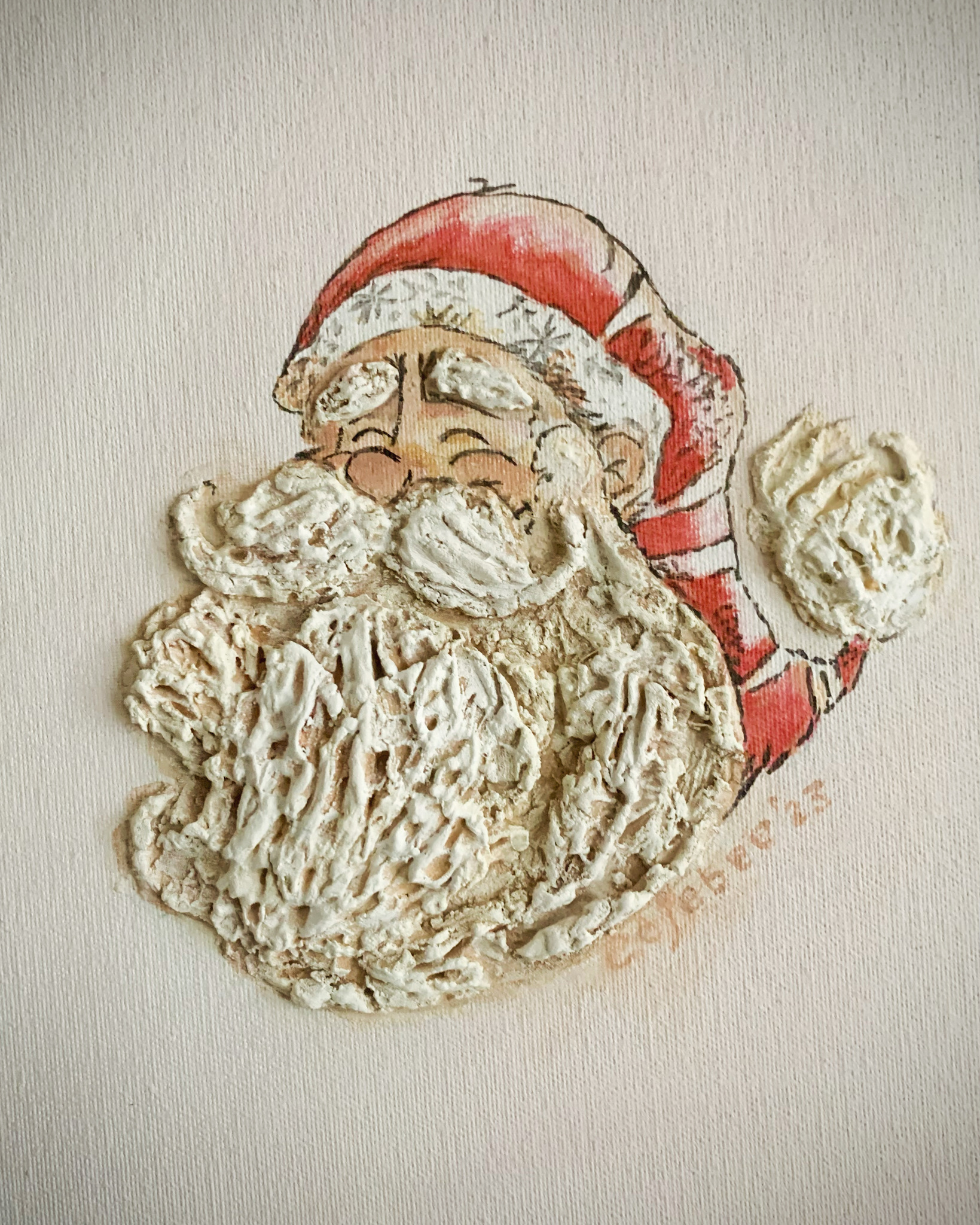 Kerst nadert. Ik zag deze kerstman voorbij komen en we kregen als opdracht 'probeer meer structuur in het schilderwerk te brengen'. Ik zag zijn volle baard en bedacht me, dat deze voller en boller moest worden.